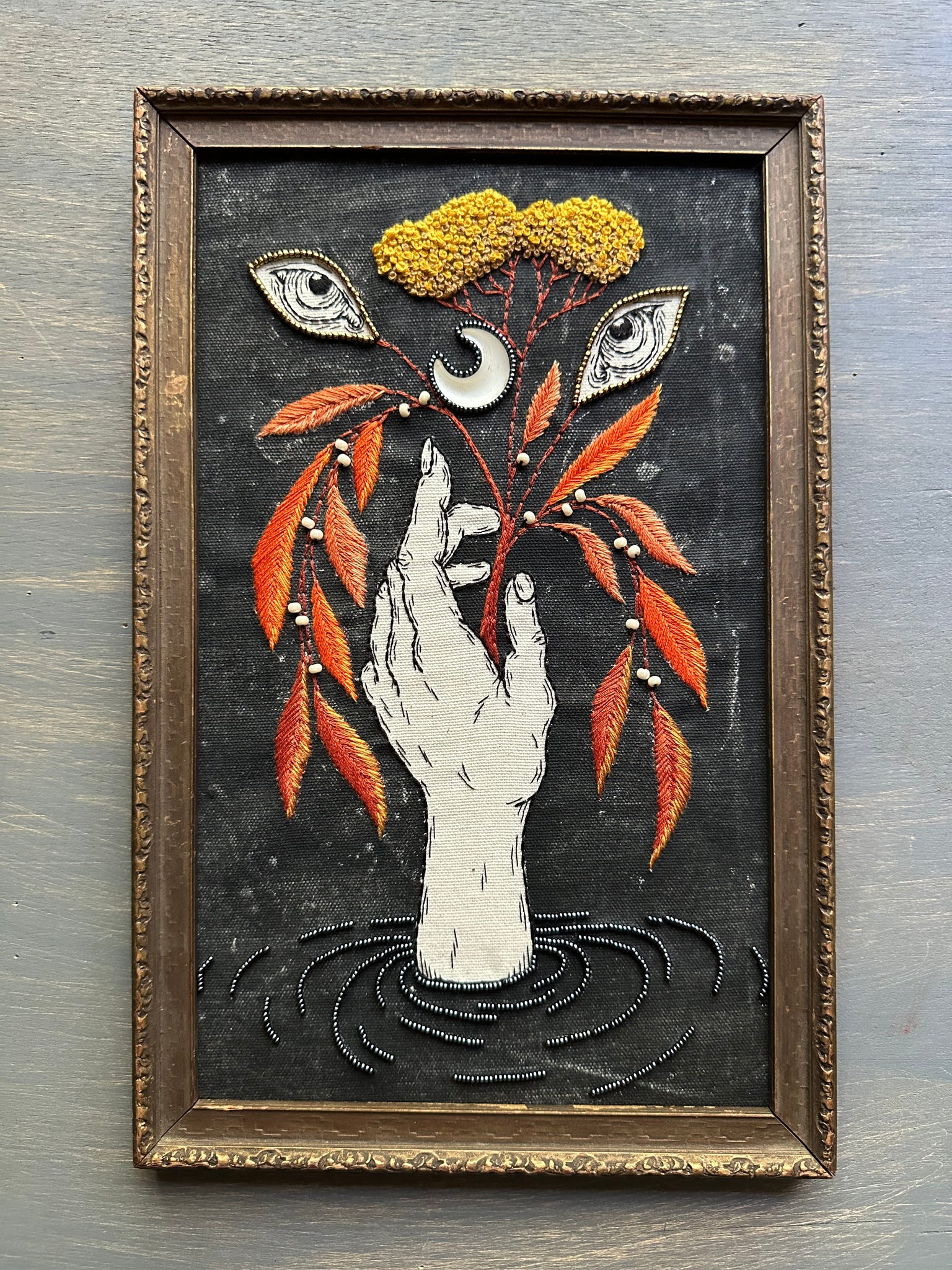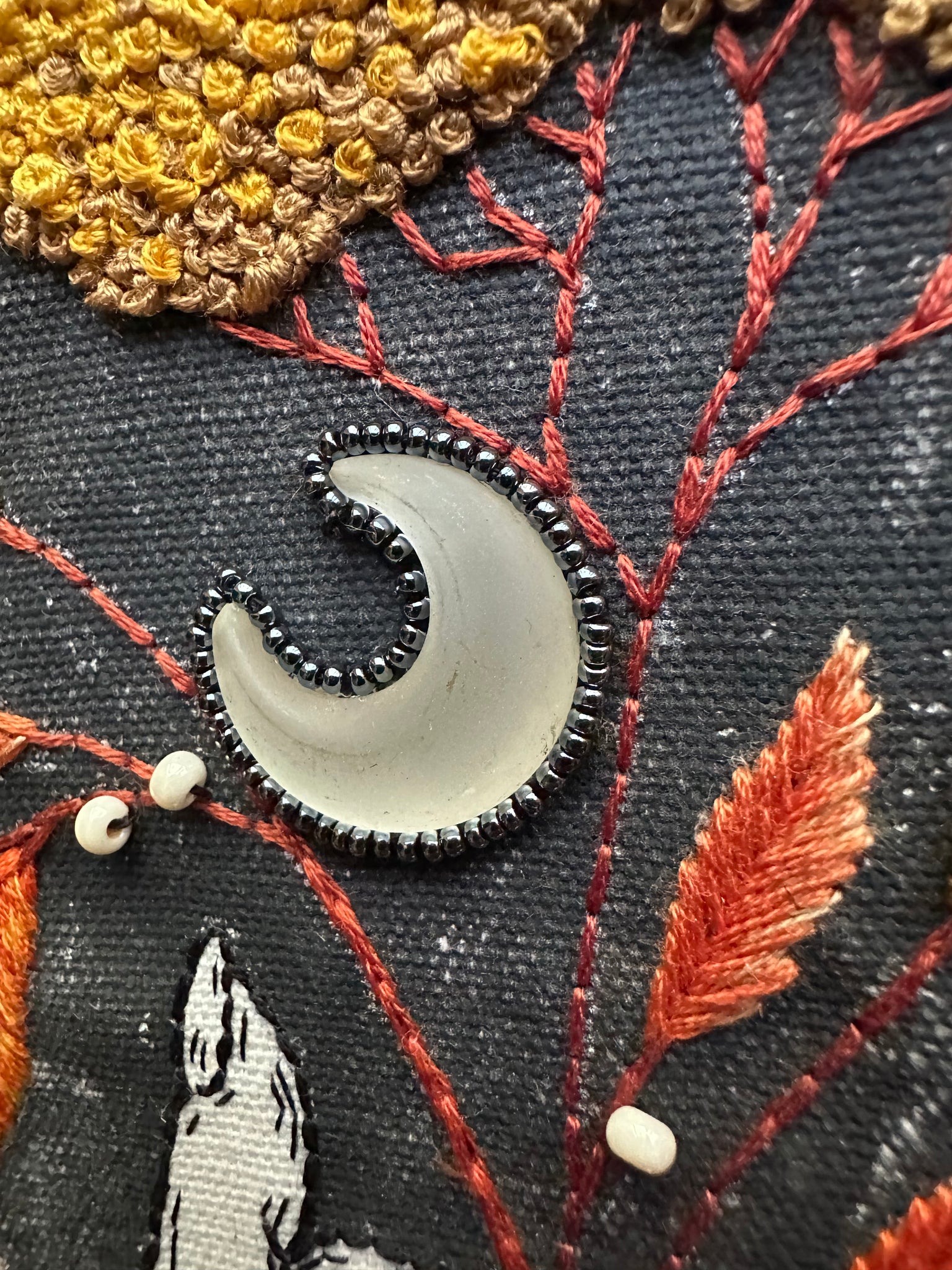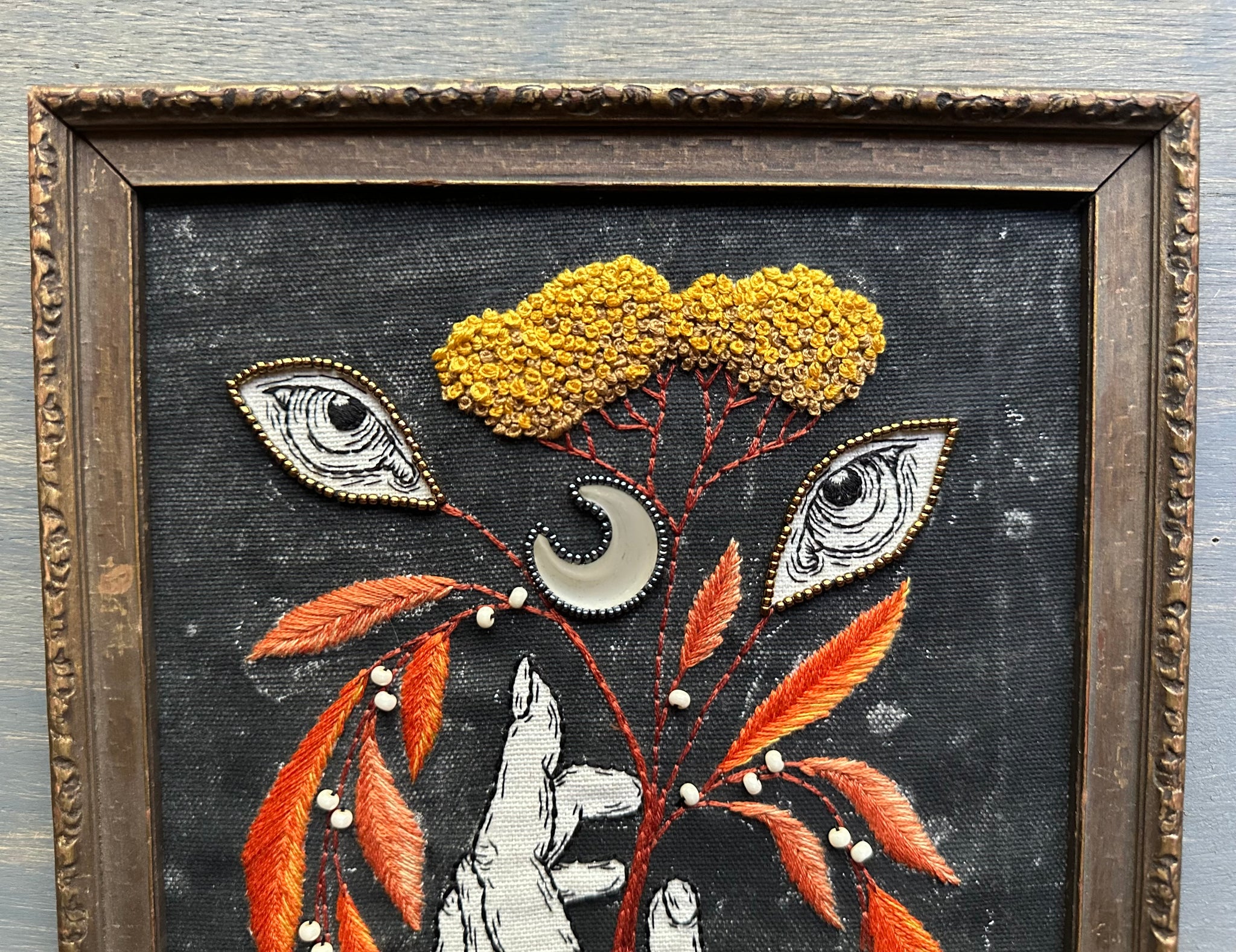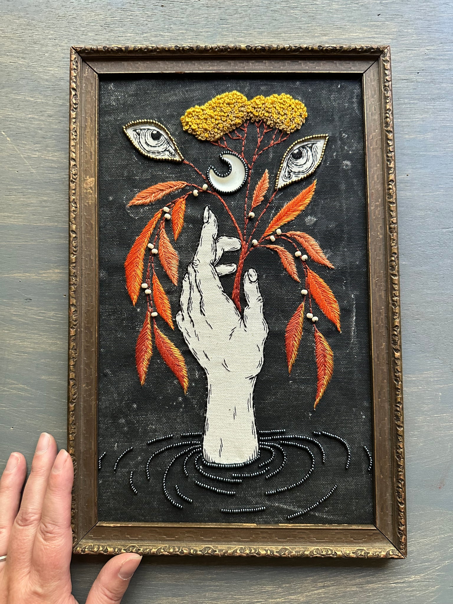 What magic lies hidden in the deep. Hand embroidered on painted canvas fabric. Black painted background is sanded and distressed. Vintage moon cabochon is scratched. Set in a vintage frame that is worn, scratched and chipped. Worn elements used to add to the pieces aged and worn look.