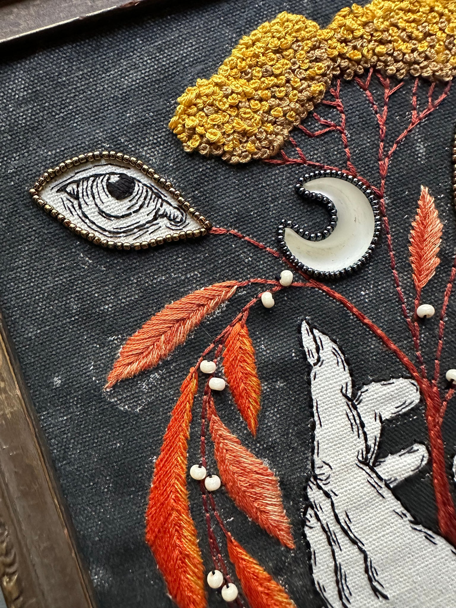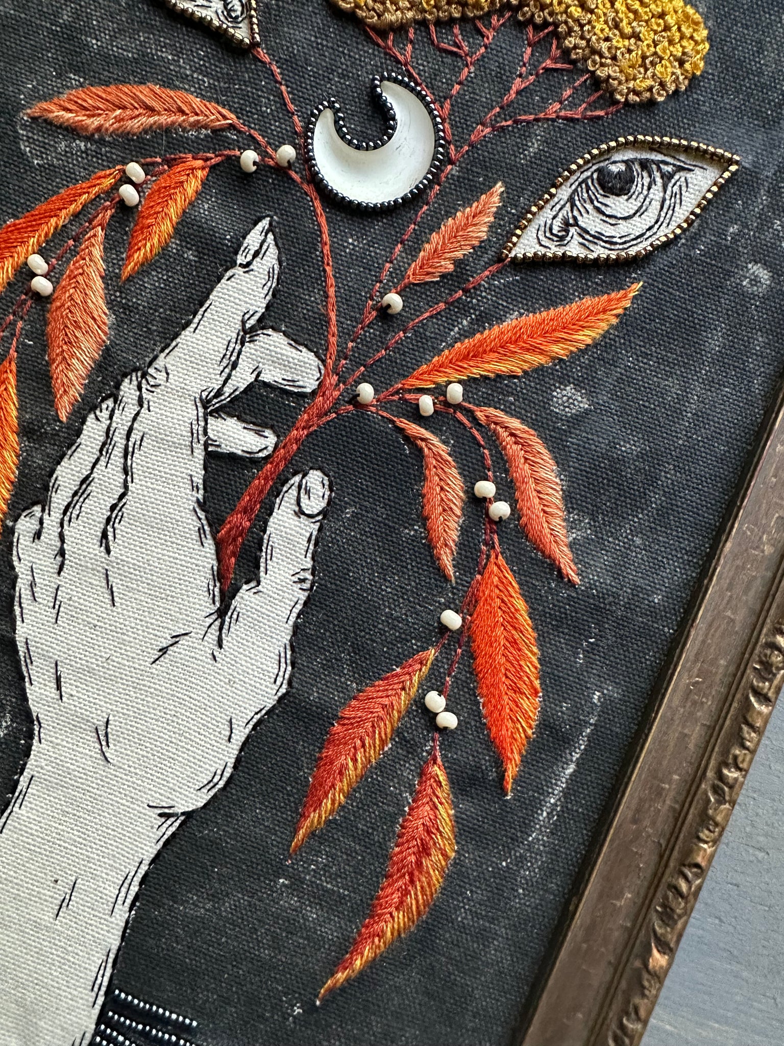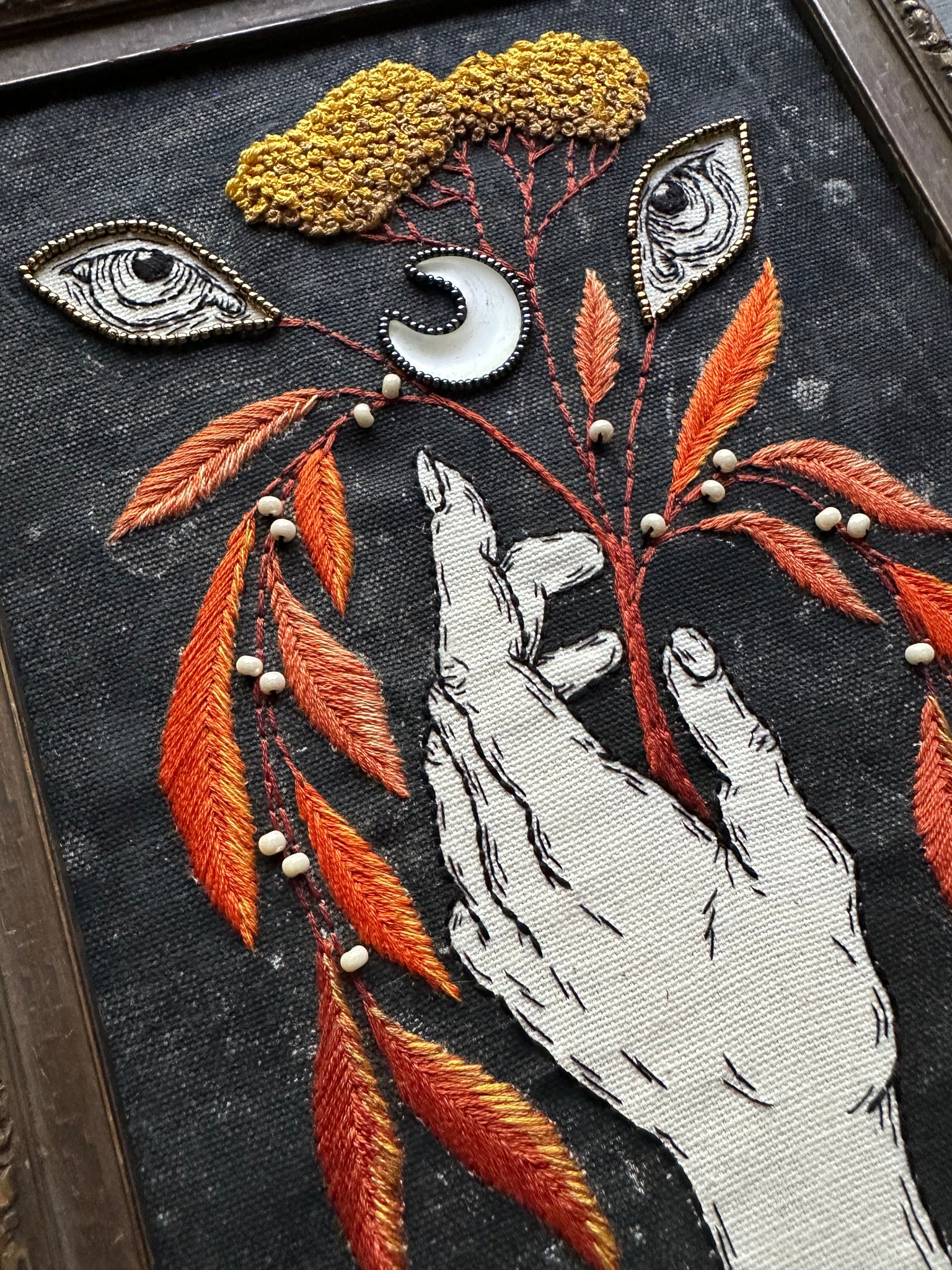 What magic lies hidden in the deep. Hand embroidered on painted canvas fabric. Black painted background is sanded and distressed. Vintage moon cabochon is scratched. Set in a vintage frame that is worn, scratched and chipped. Worn elements used to add to the pieces aged and worn look.