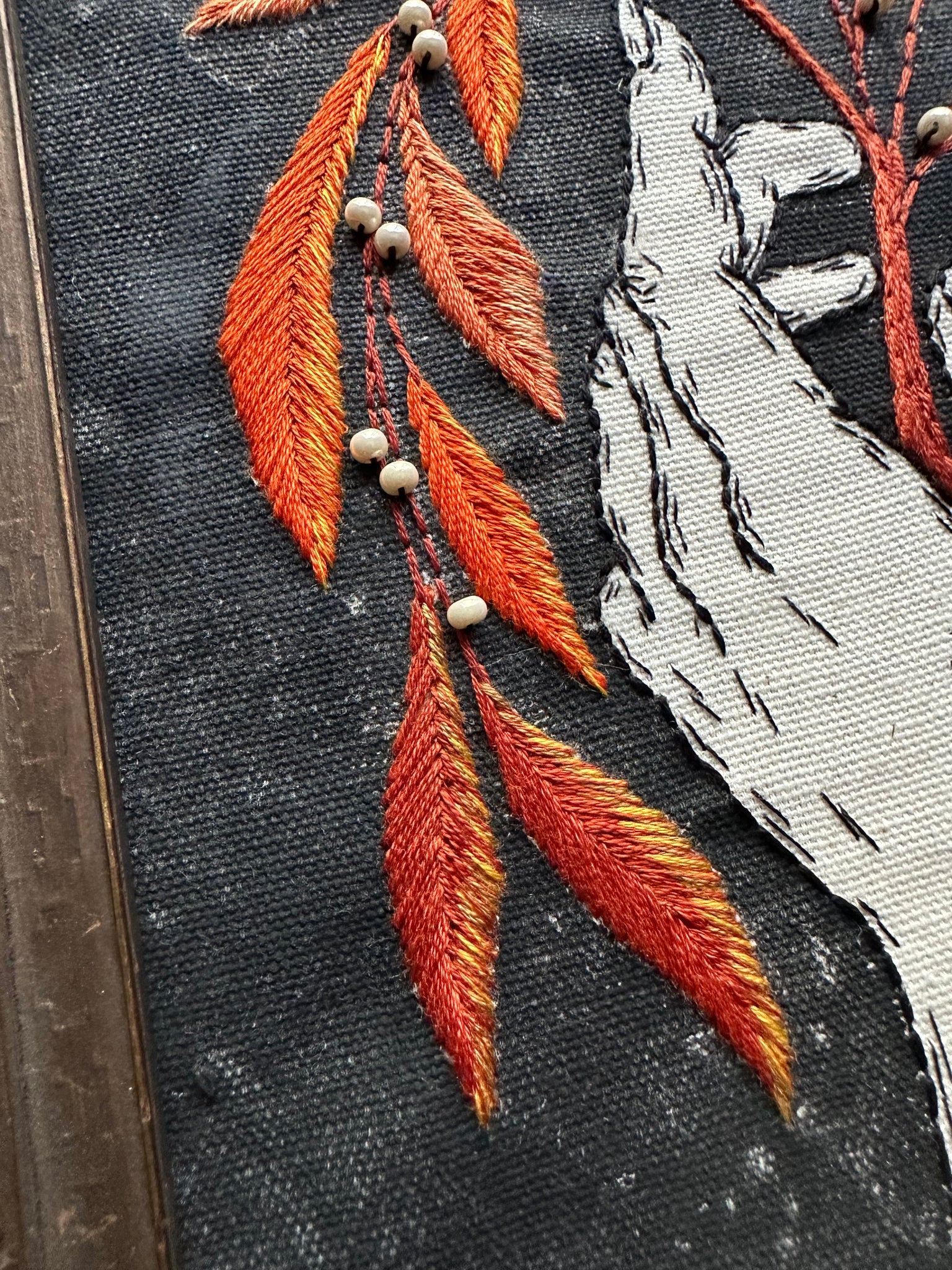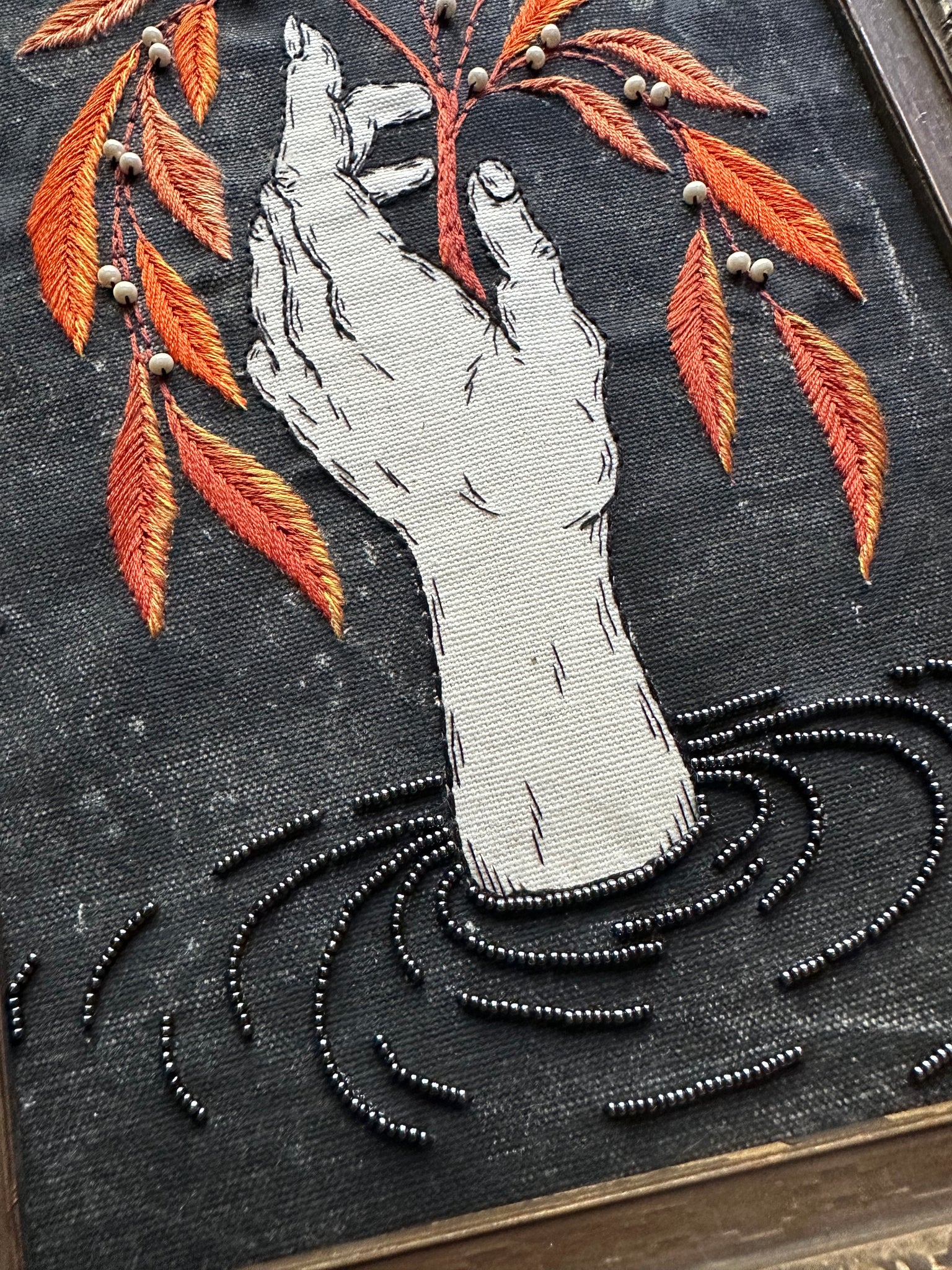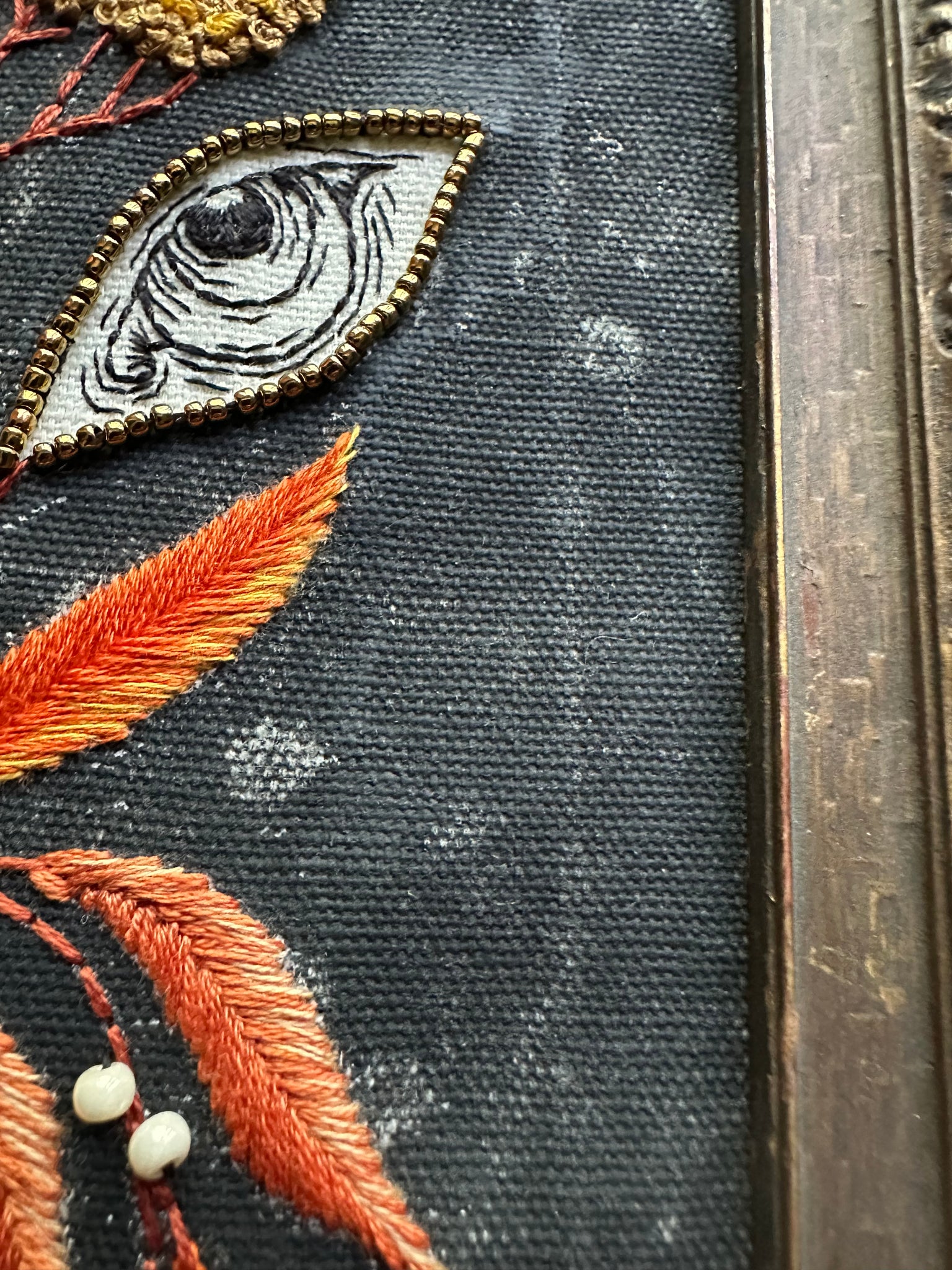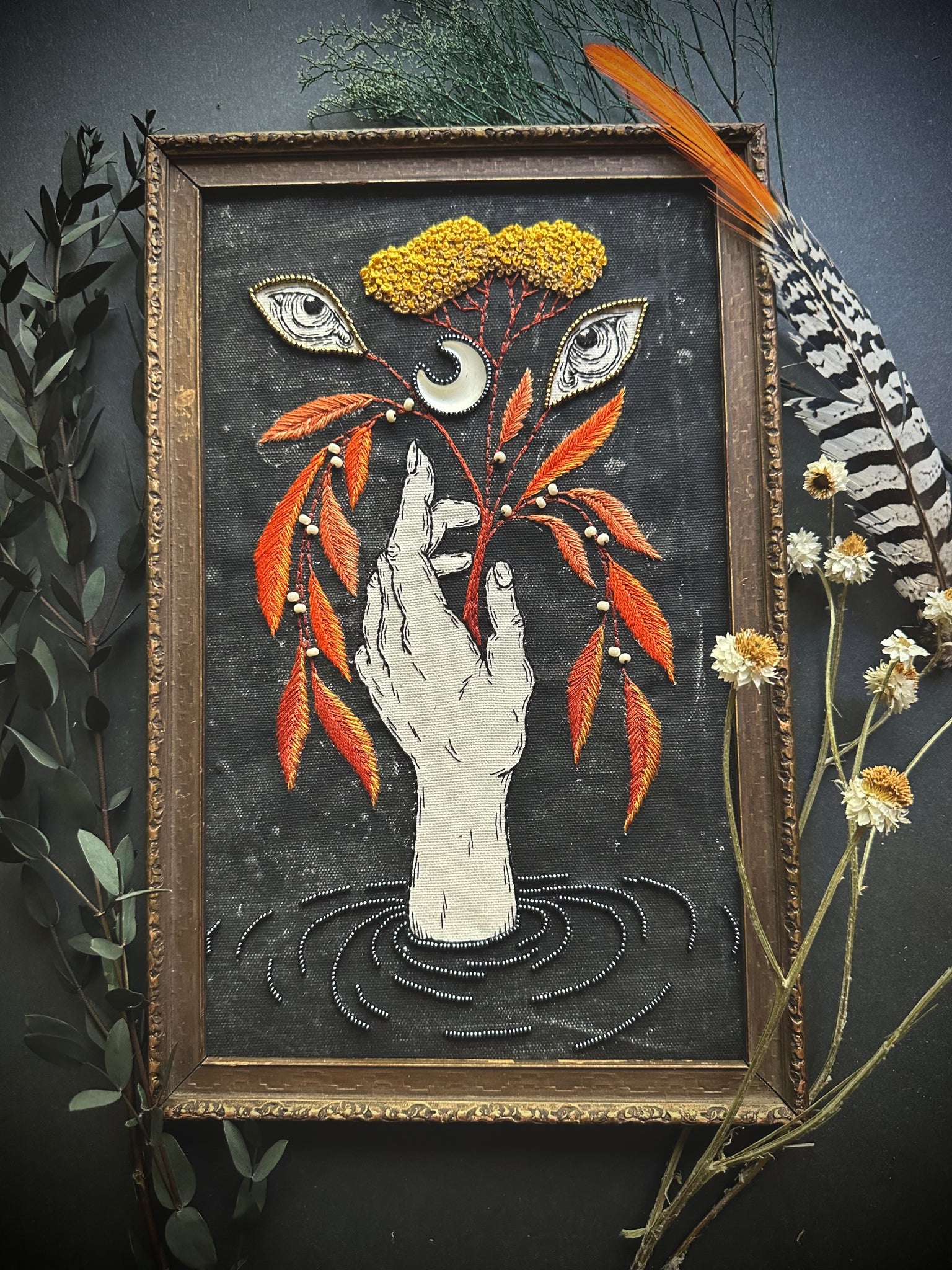What magic lies hidden in the deep. Hand embroidered on painted canvas fabric. Black painted background is sanded and distressed. Vintage moon cabochon is scratched. Set in a vintage frame that is worn, scratched and chipped. Worn elements used to add to the pieces aged and worn look.