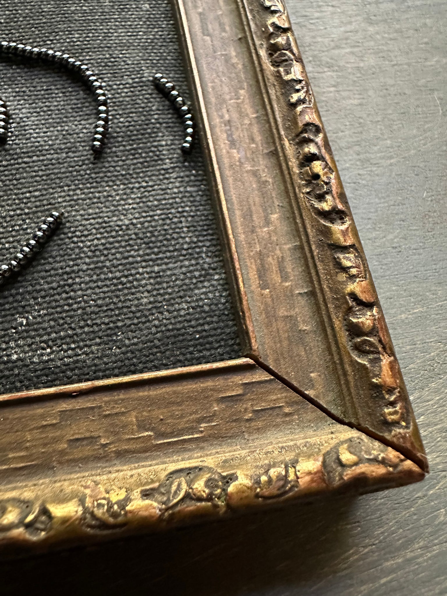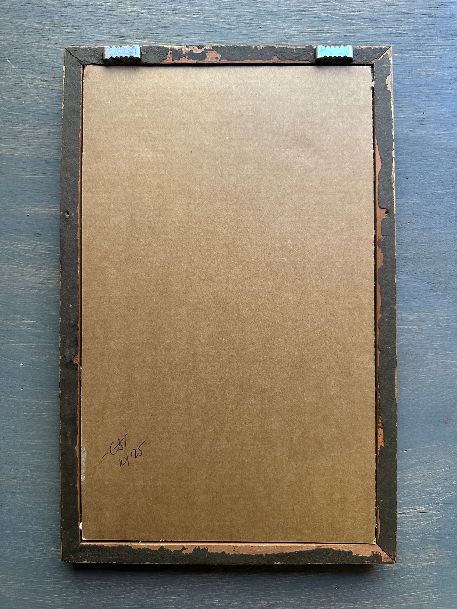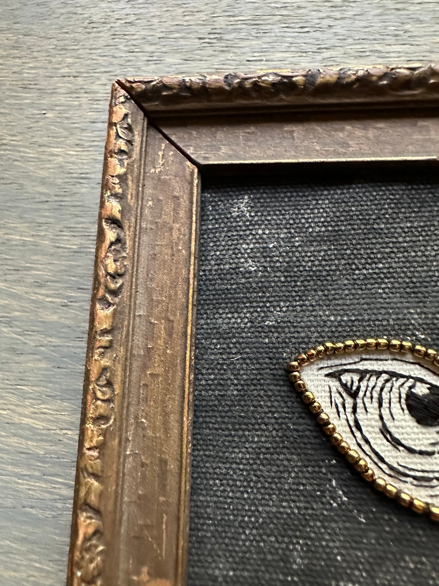 Handmade piece set in a vintage wooden frame. Imperfections are to be expected. Please examine the images closely and read the full description to avoid disappointment as returns are not accepted.