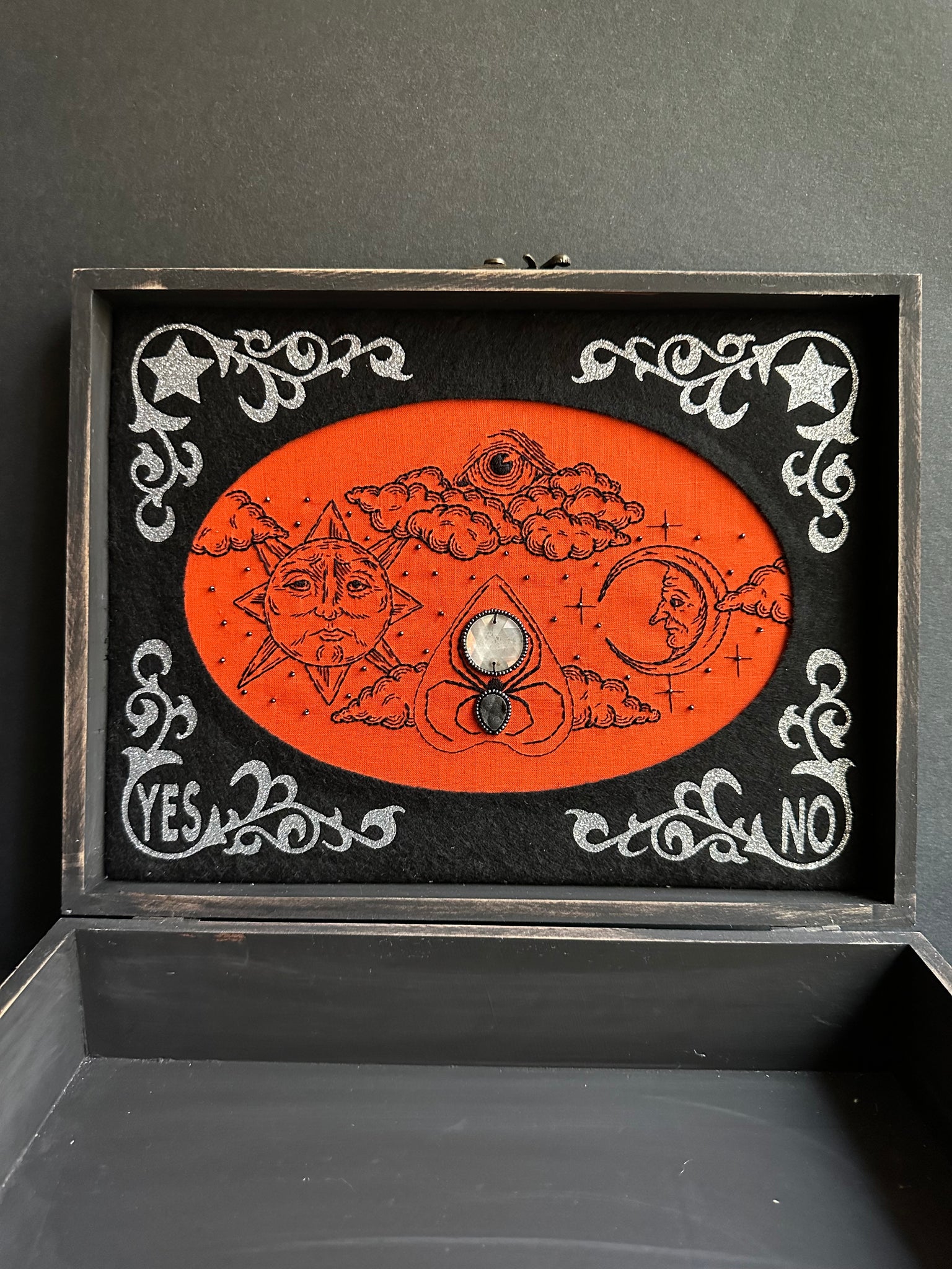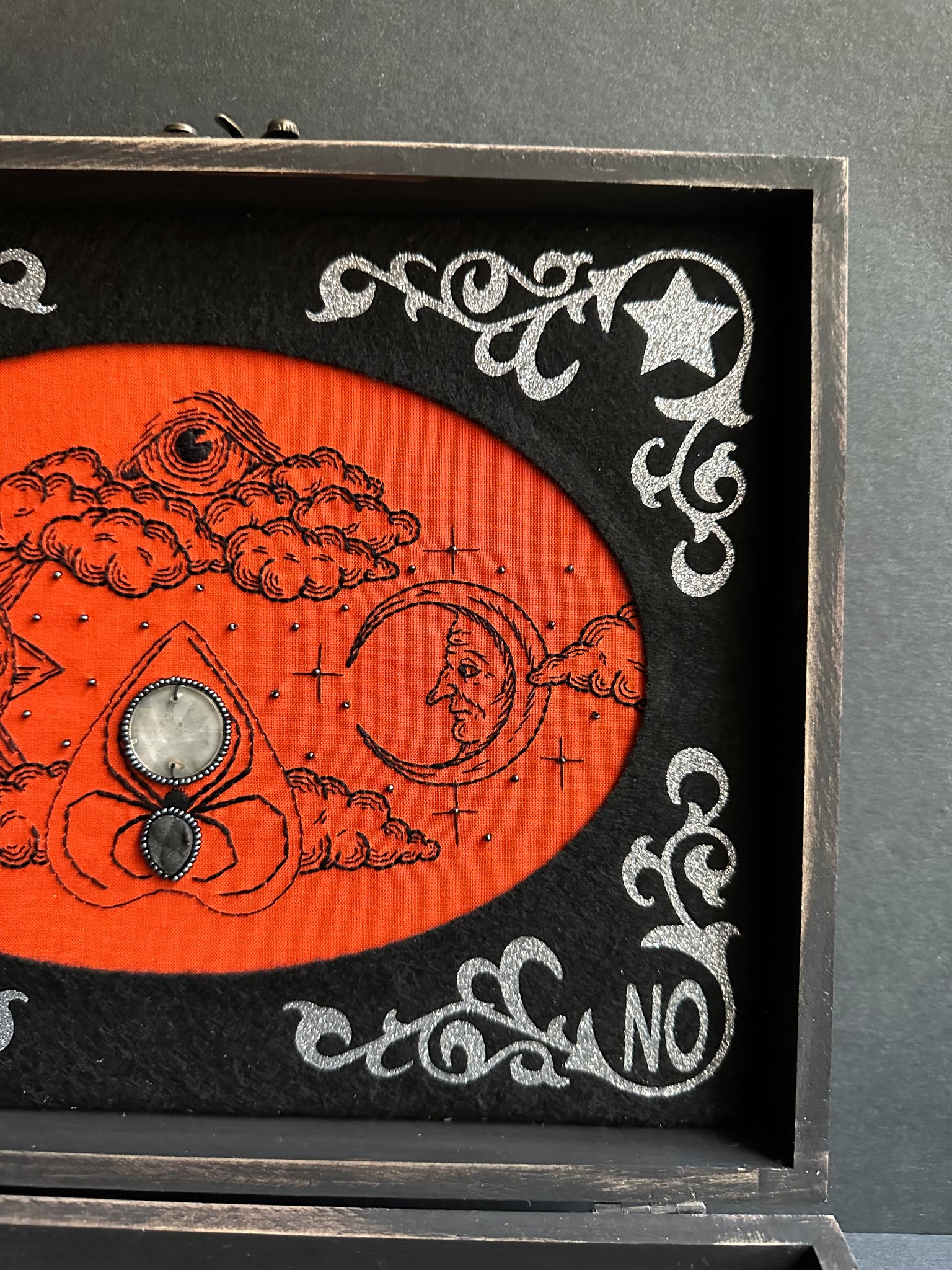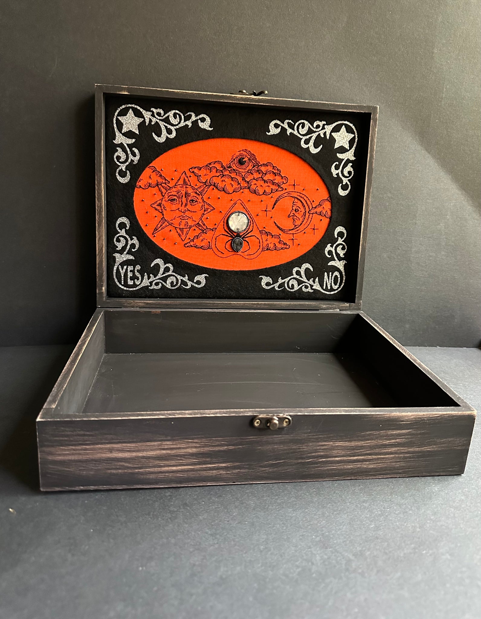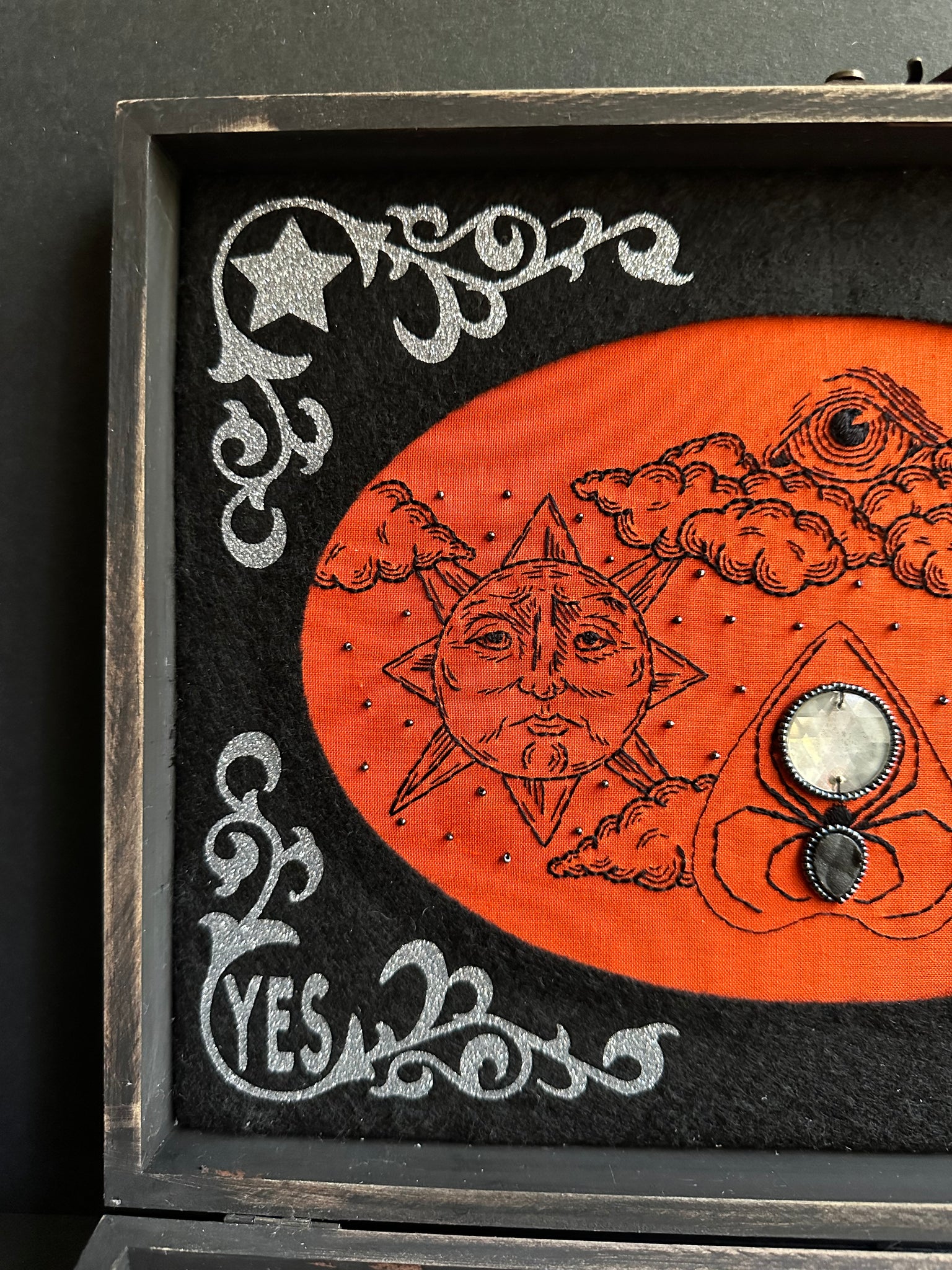 A Ouija box, ready to be filled with ones sacred treasures. This painted and distressed wooden box is decorated with a black glitter ouija board on its lid. Inside the lid is a hand embroidered illustration inspired by vintage ouija designs. The spider planchette is composed of vintage cabochons that are worn due to age.