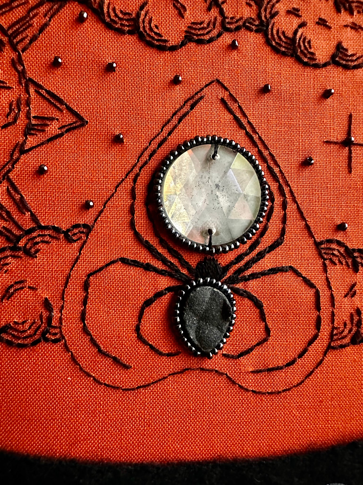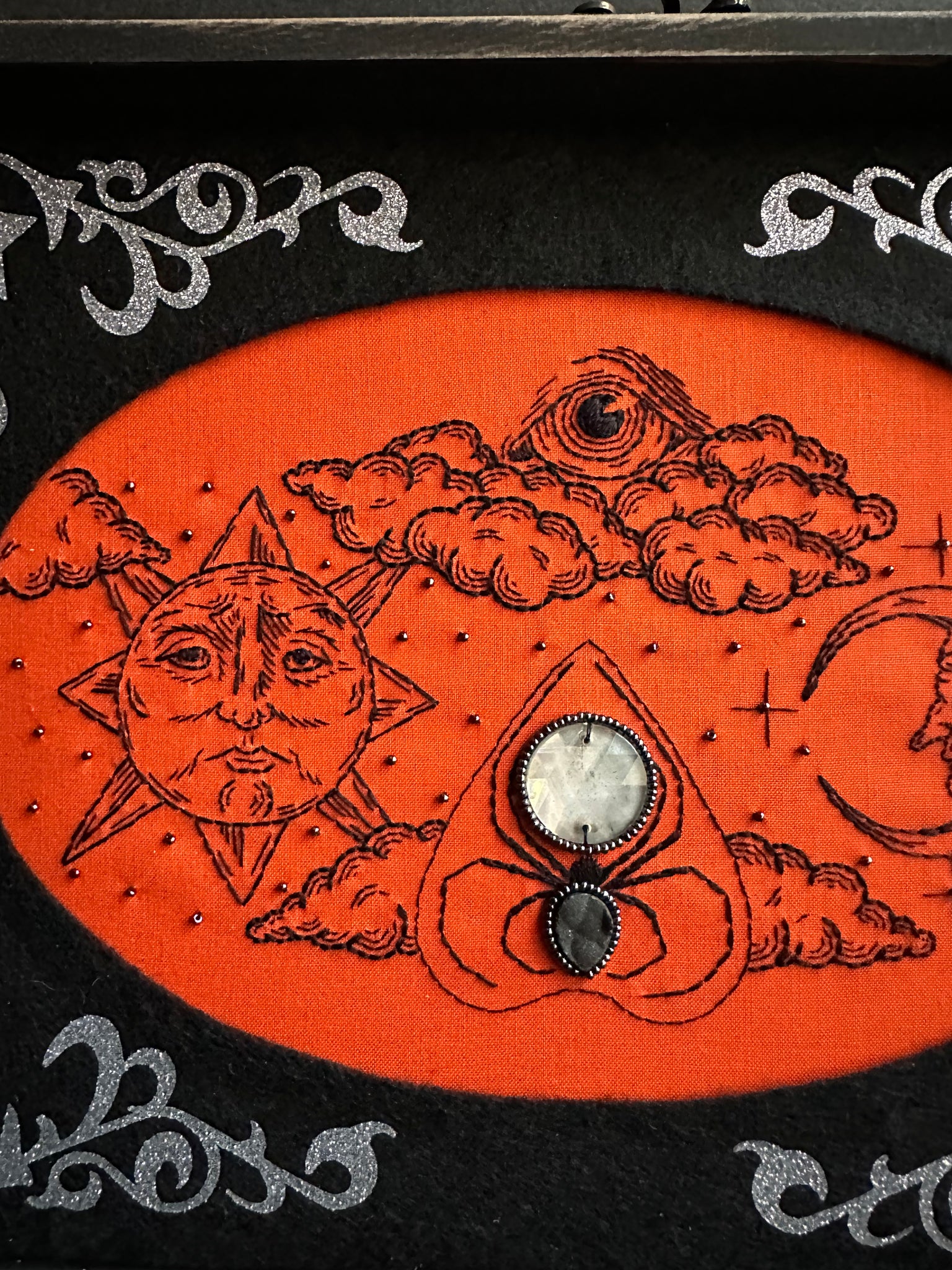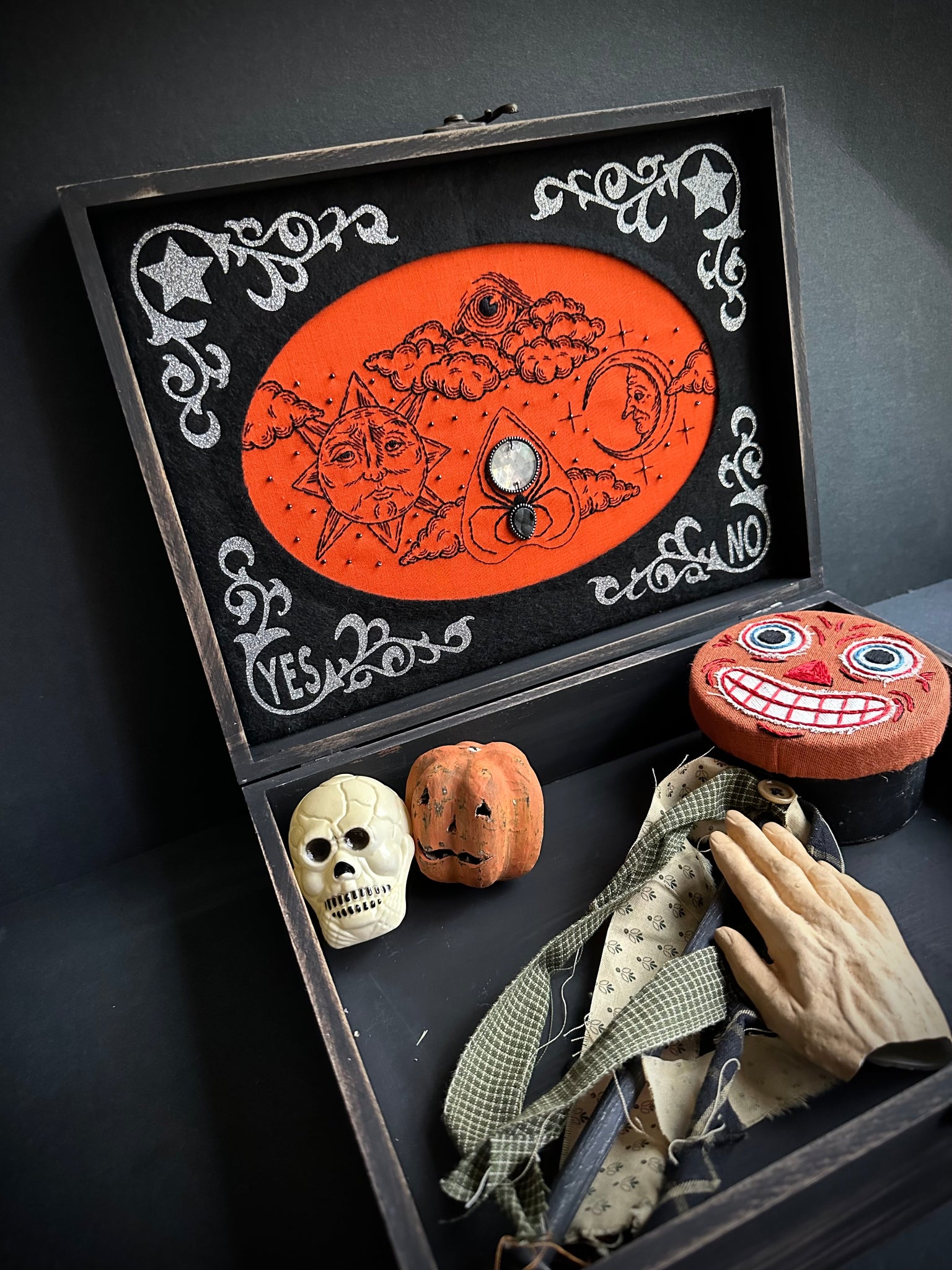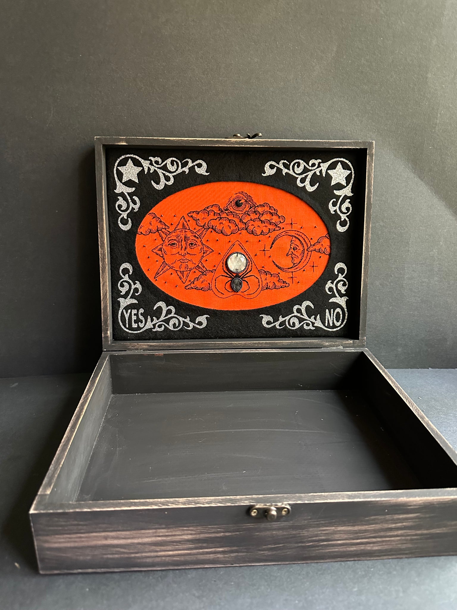A Ouija box, ready to be filled with ones sacred treasures. This painted and distressed wooden box is decorated with a black glitter ouija board on its lid. Inside the lid is a hand embroidered illustration inspired by vintage ouija designs. The spider planchette is composed of vintage cabochons that are worn due to age.