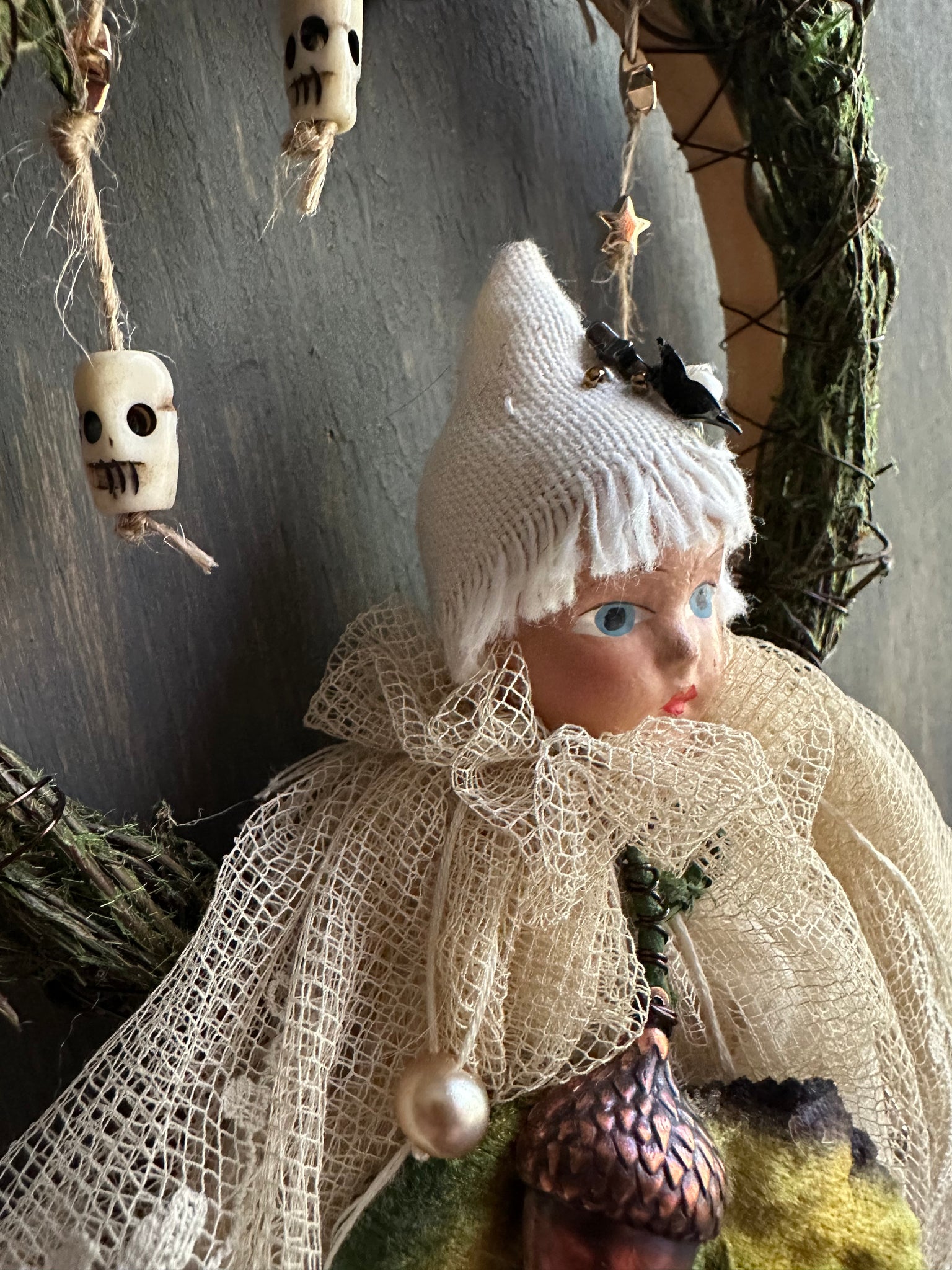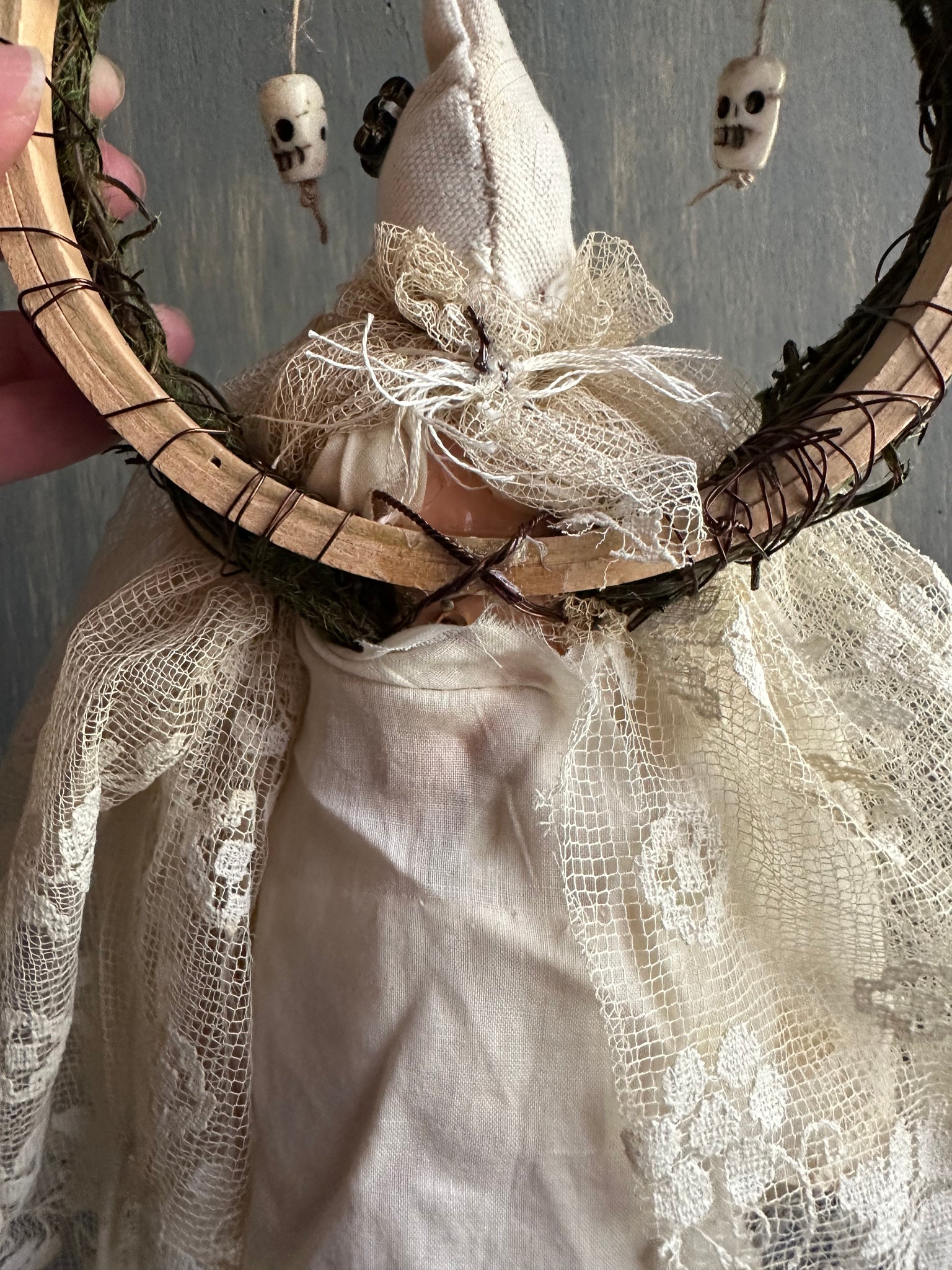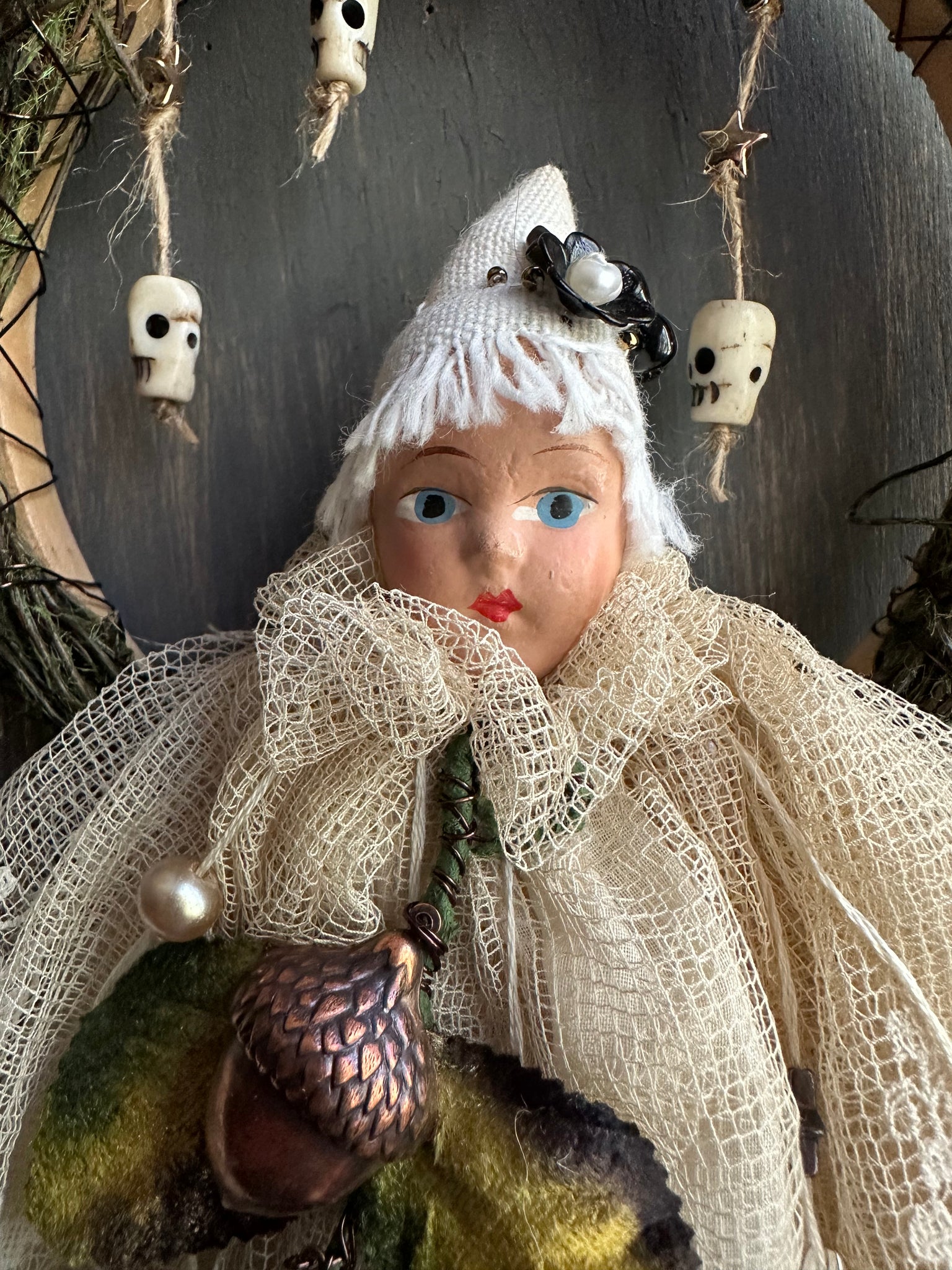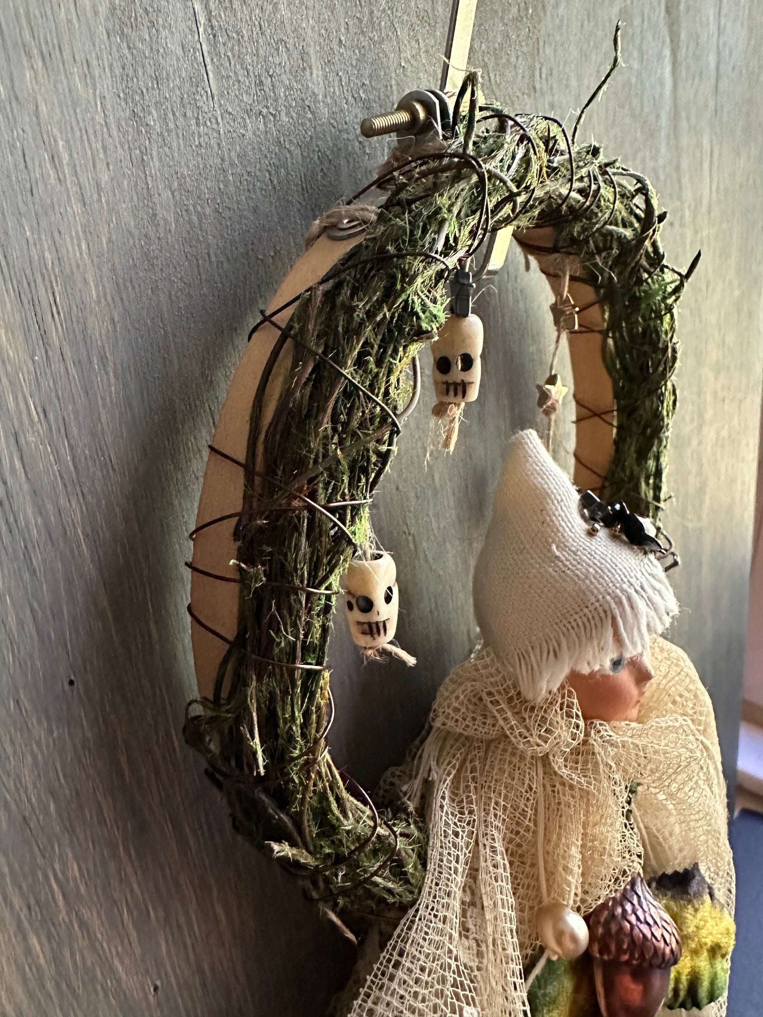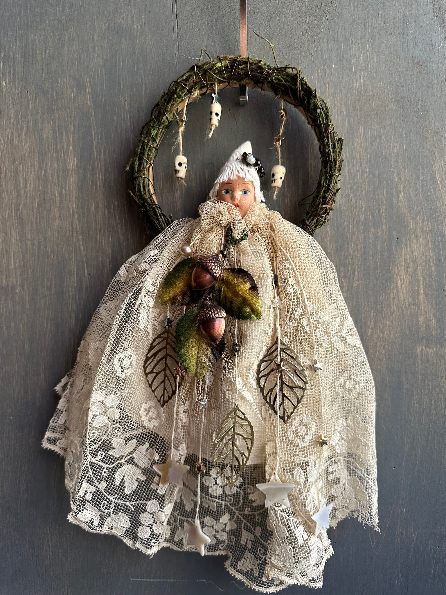 Don't trust the creatures of the forest.  An assemblage of various vintage items come together to create this little forest sprite.  A vintage doll is dressed in vintage lace accented with vintage millinery leaves and metal stamped acorns.  She hovers within a wreath composed of faux branches and moss.  Small skull beads hang from within the wreath.  All components are vintage and show signs of age including stains, tears, discoloration, chips and overall wear.