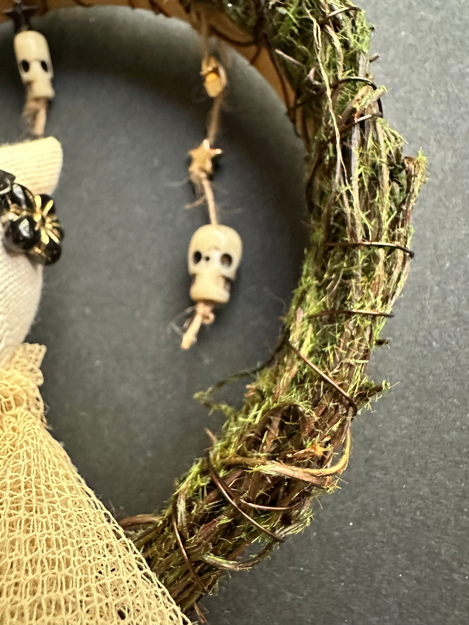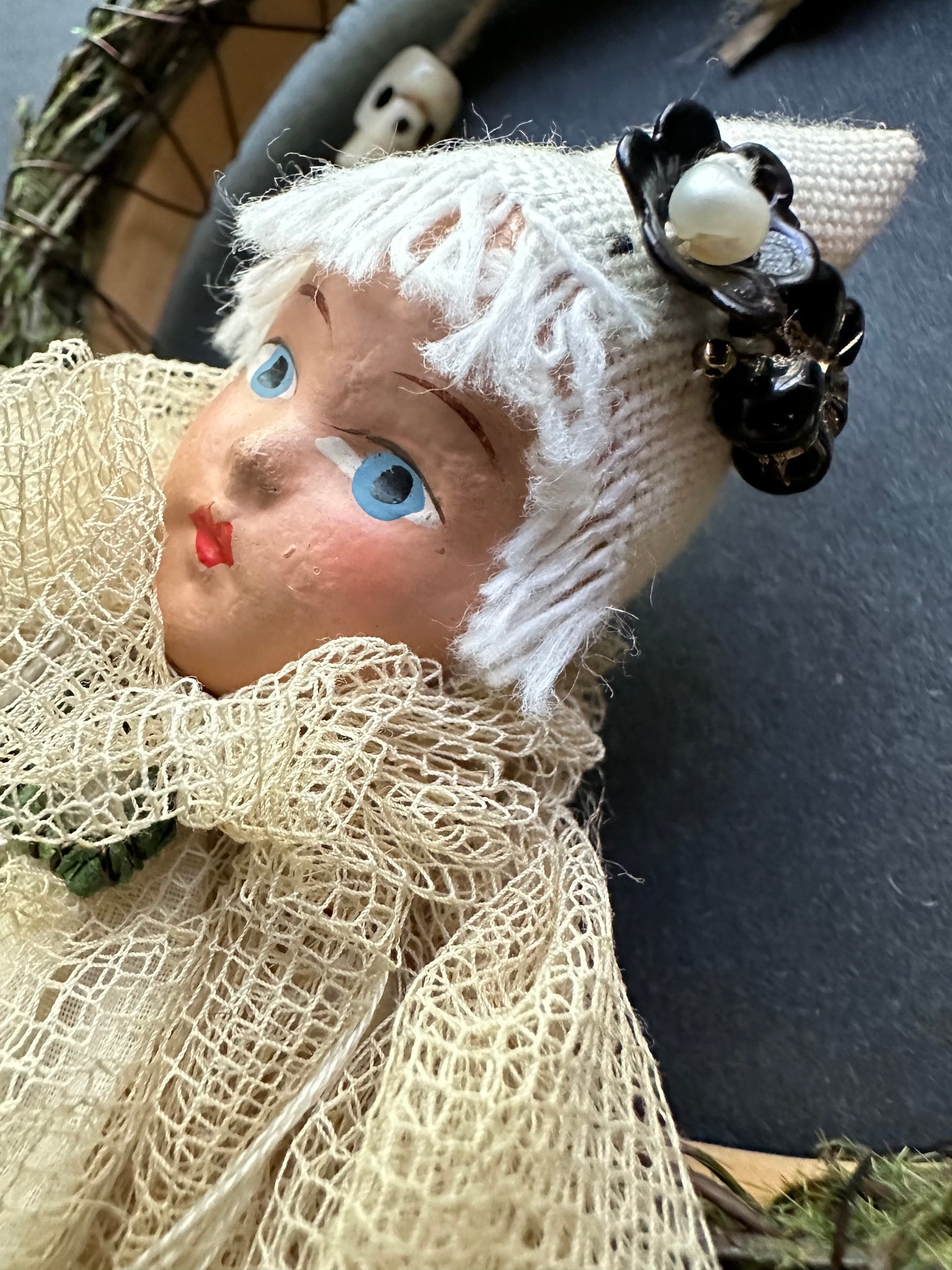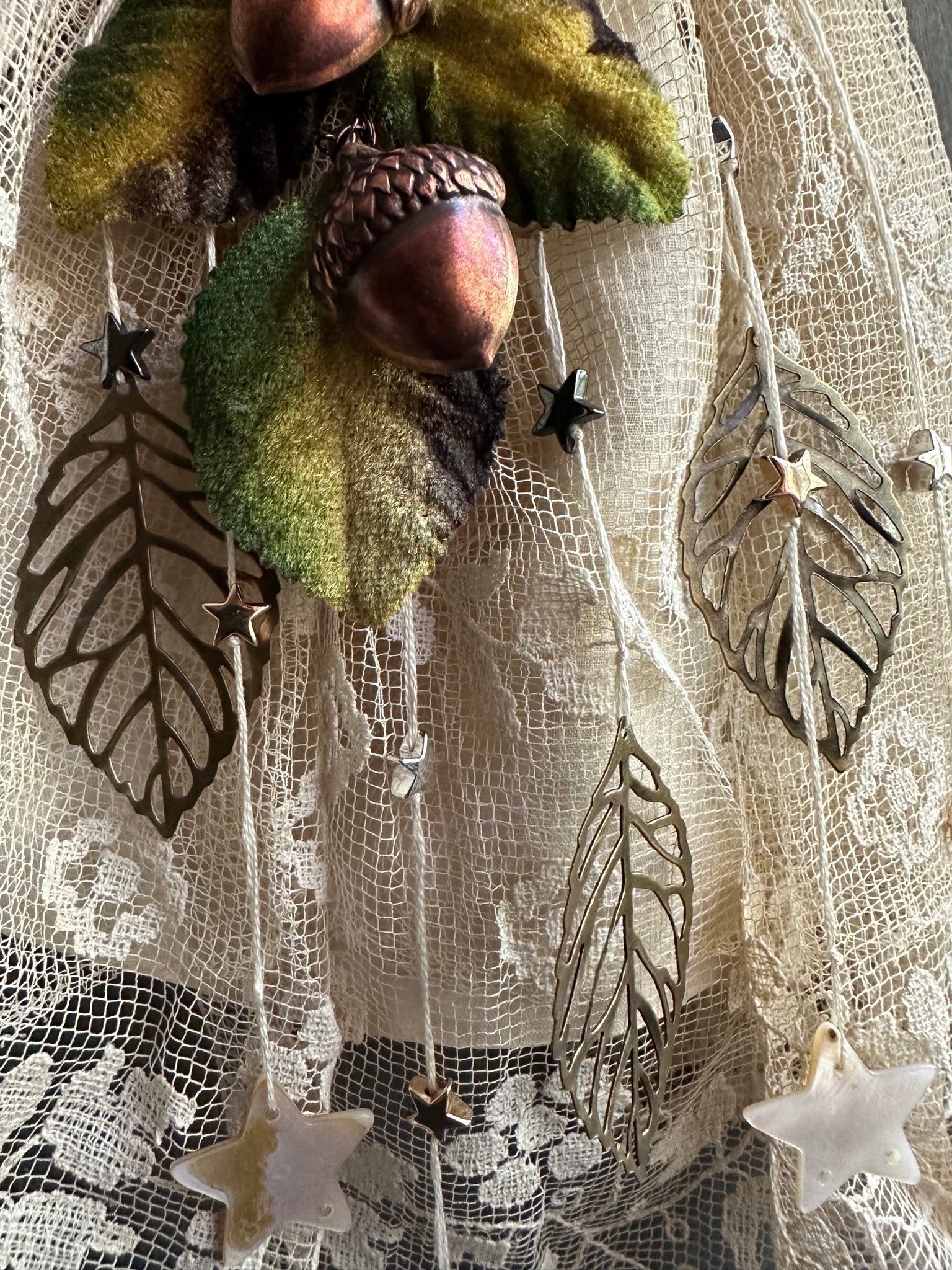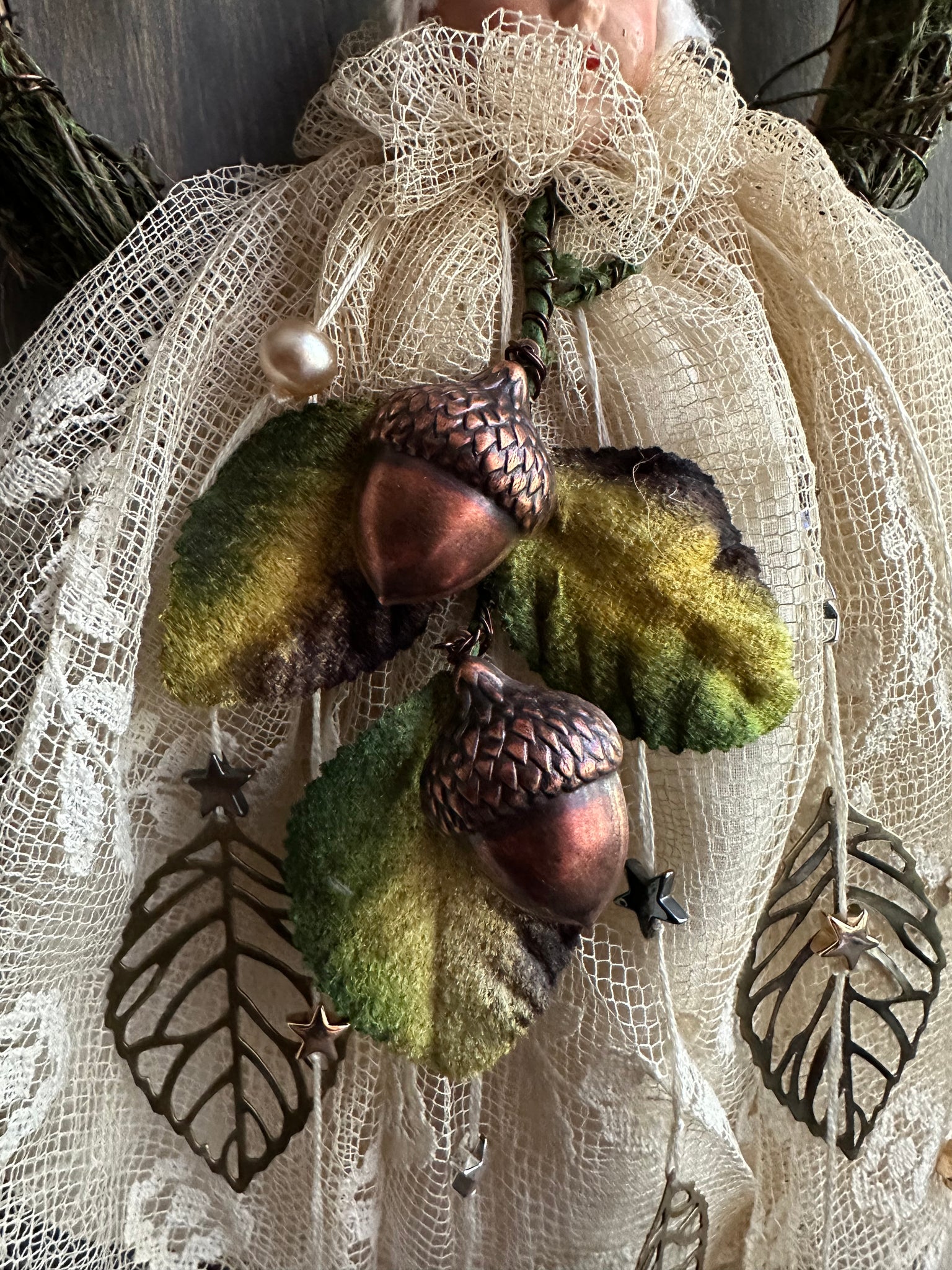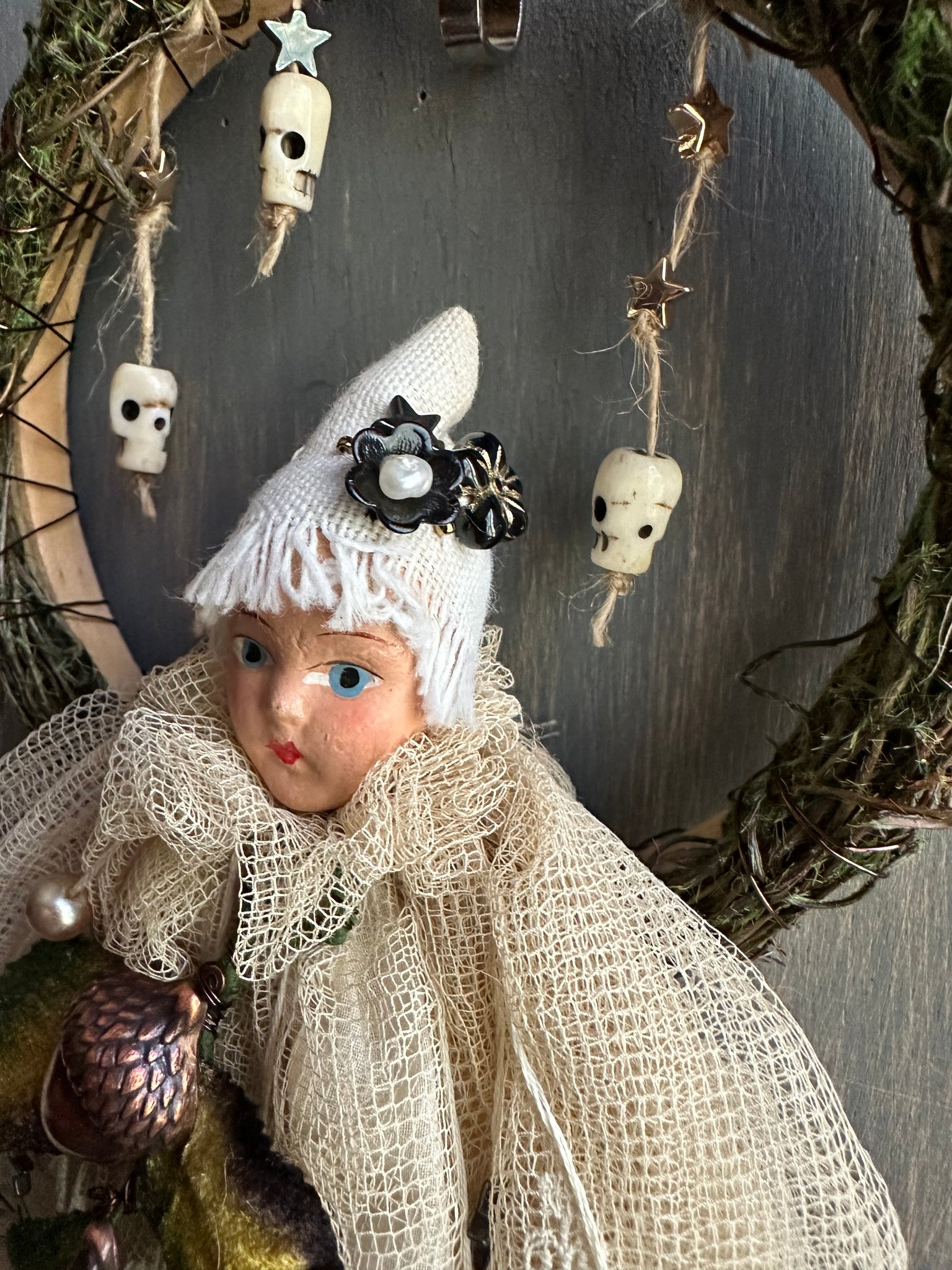 Don't trust the creatures of the forest.  An assemblage of various vintage items come together to create this little forest sprite.  A vintage doll is dressed in vintage lace accented with vintage millinery leaves and metal stamped acorns.  She hovers within a wreath composed of faux branches and moss.  Small skull beads hang from within the wreath.  All components are vintage and show signs of age including stains, tears, discoloration, chips and overall wear.