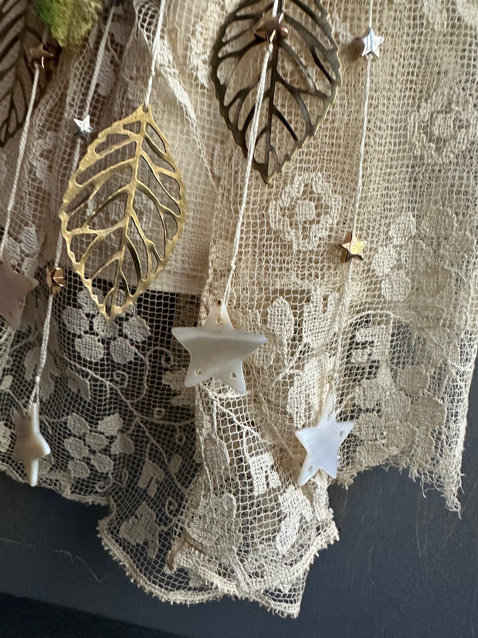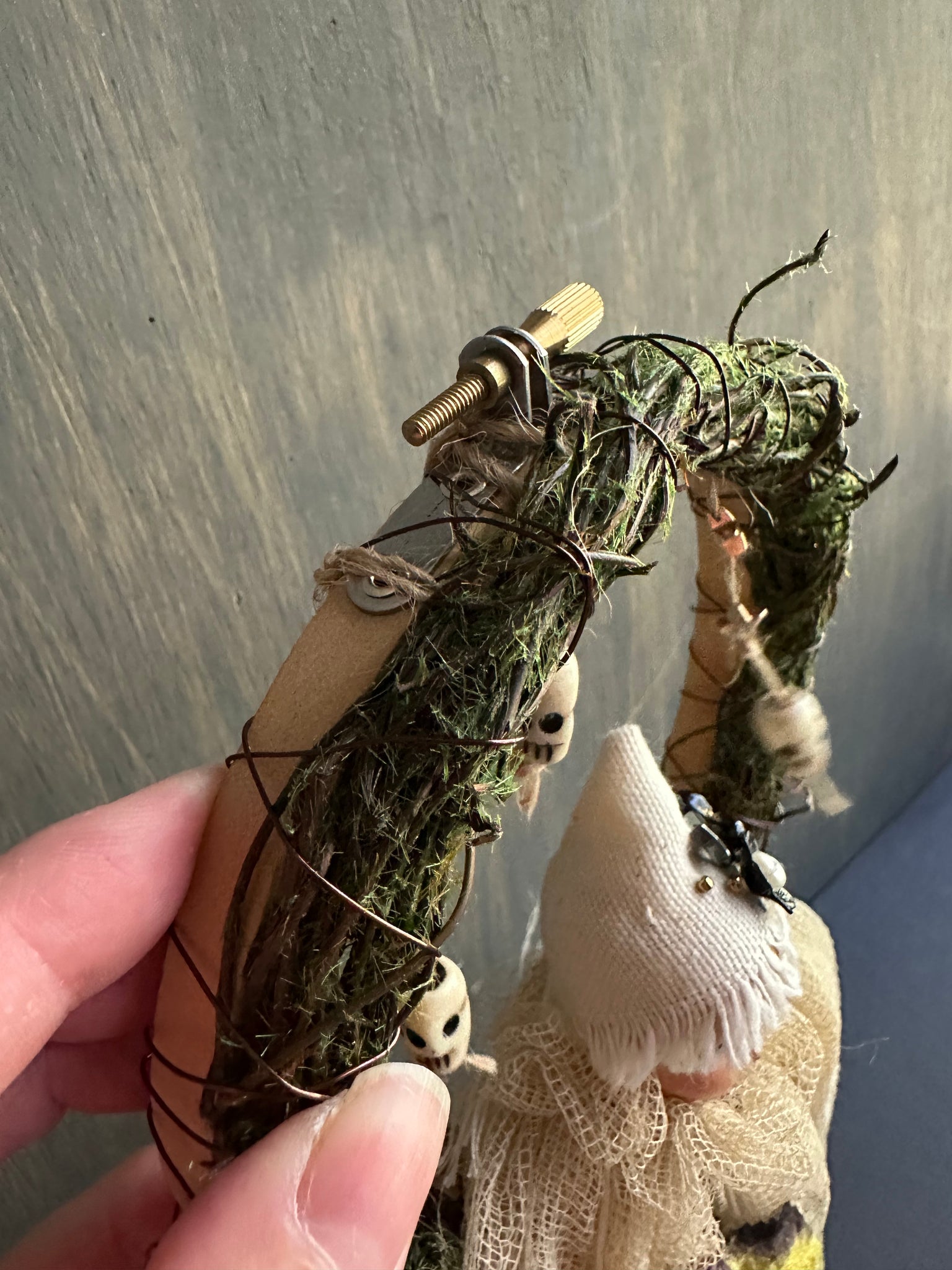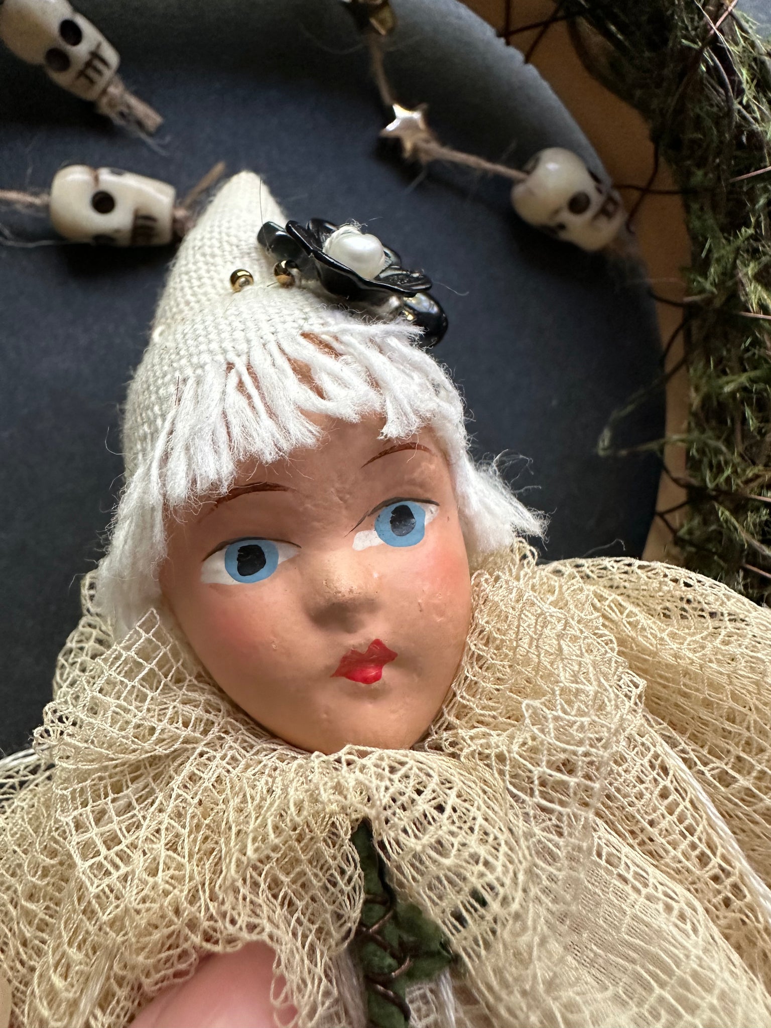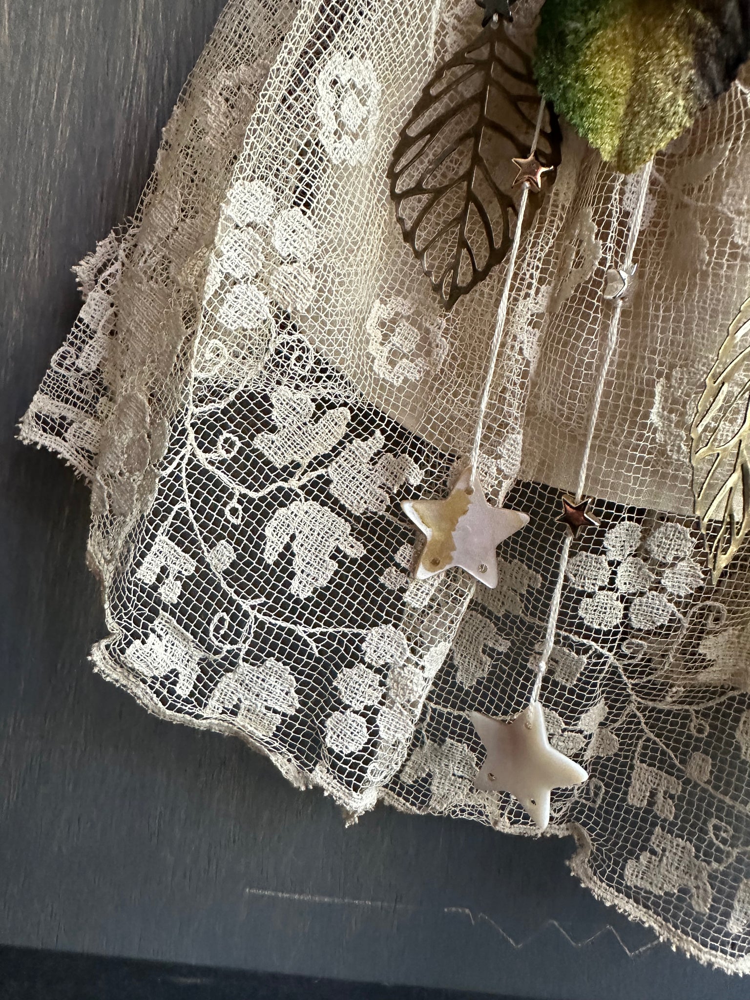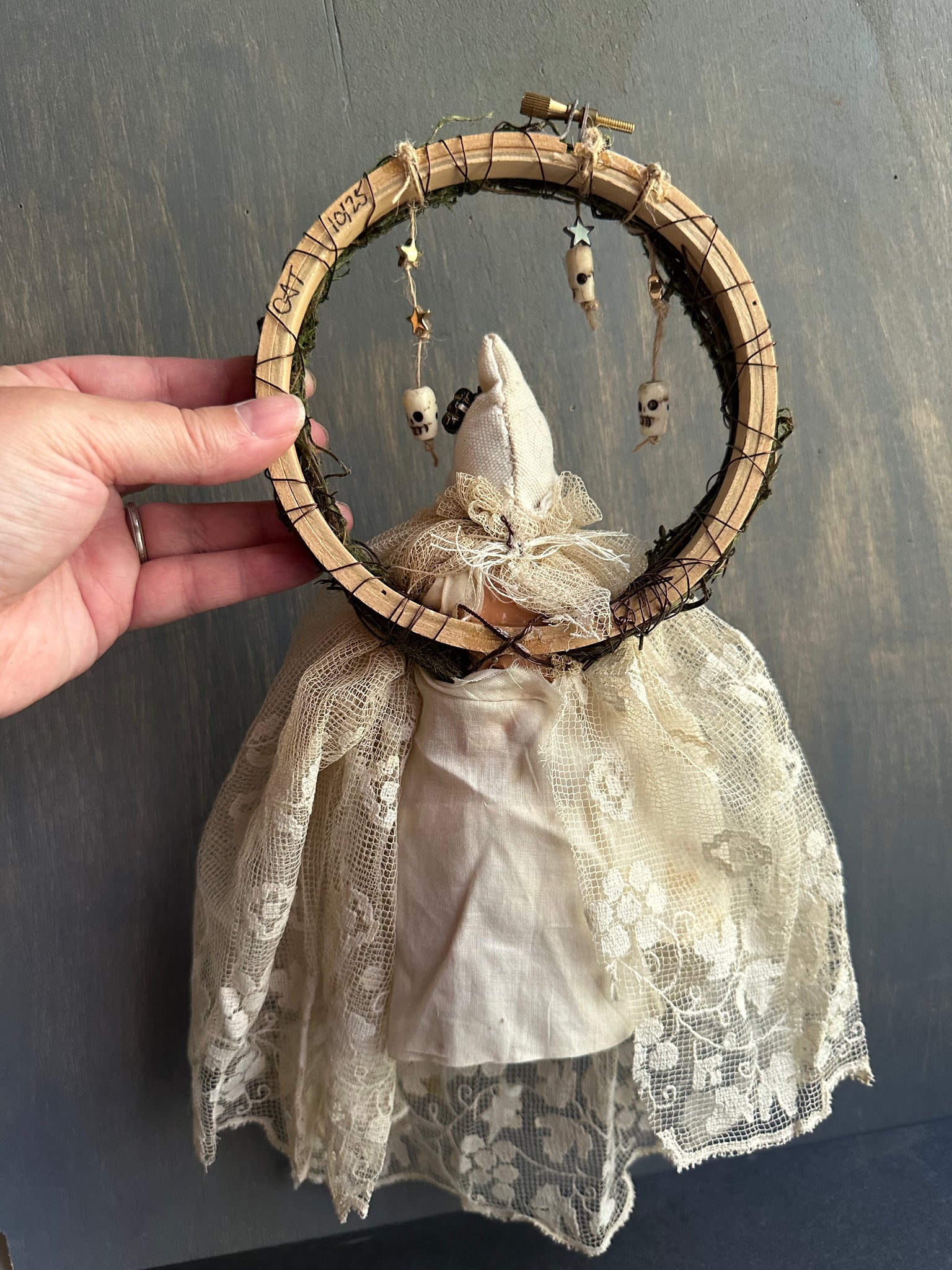 Don't trust the creatures of the forest.  An assemblage of various vintage items come together to create this little forest sprite.  A vintage doll is dressed in vintage lace accented with vintage millinery leaves and metal stamped acorns.  She hovers within a wreath composed of faux branches and moss.  Small skull beads hang from within the wreath.  All components are vintage and show signs of age including stains, tears, discoloration, chips and overall wear.