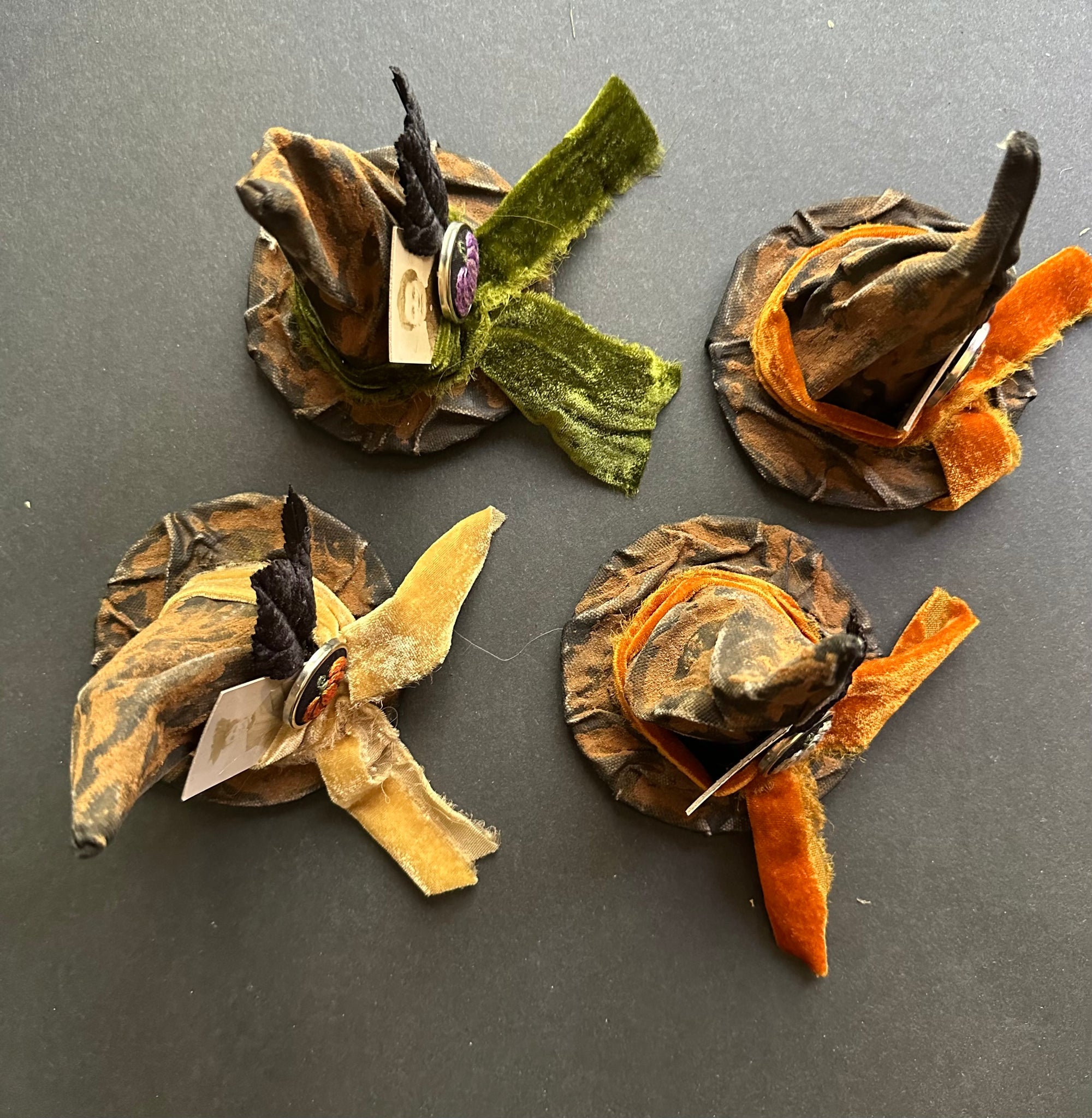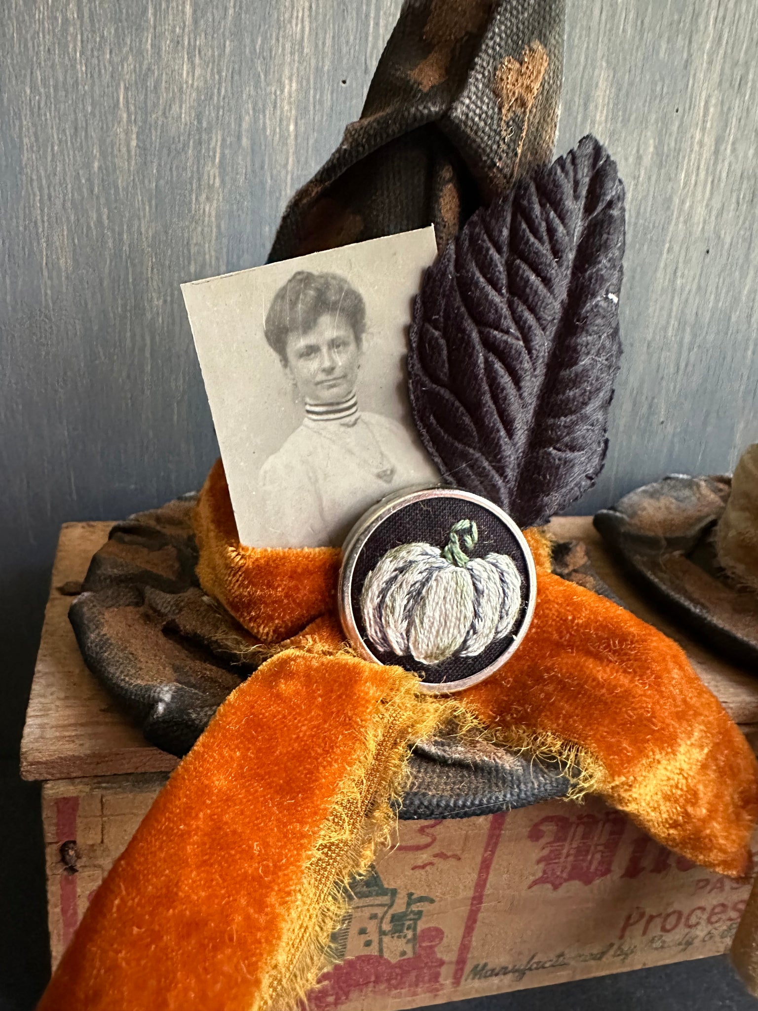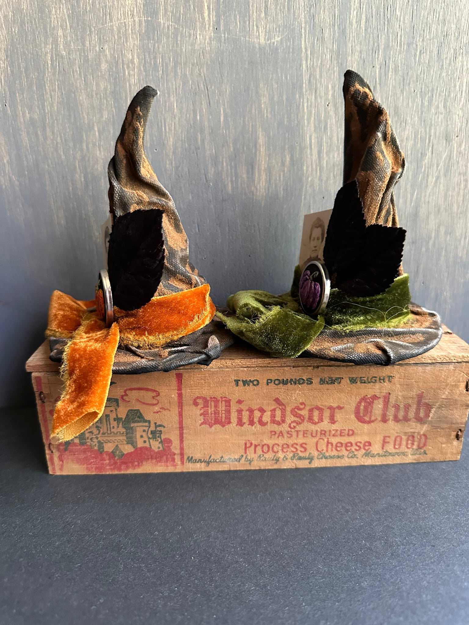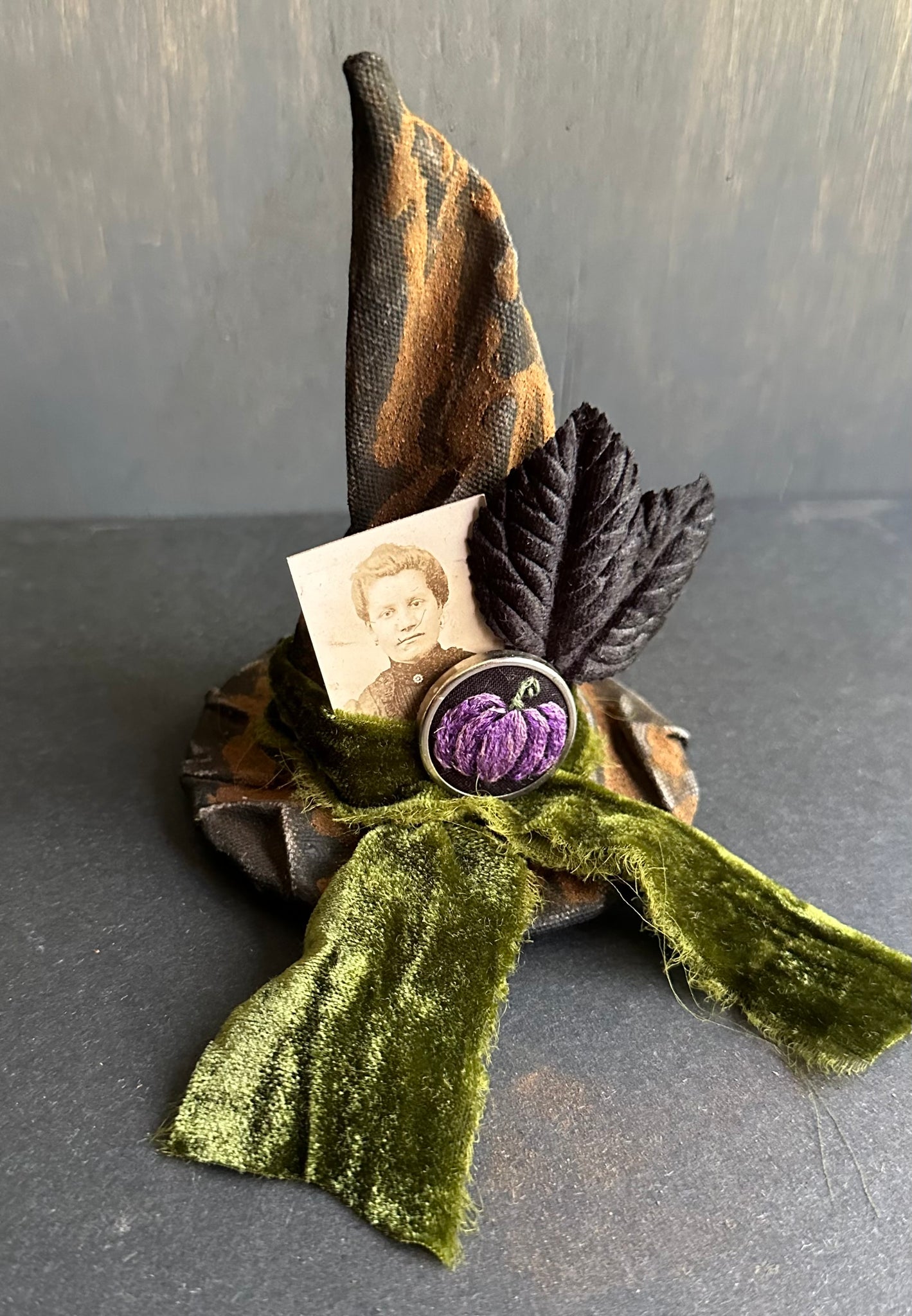 Her ancestral mini witch hats. Each handmade hat is painted and distressed then doused in cinnamon for an aged look. Sensitive noses beware as hats will smell like cinnamon, fingers may also get a little dusty. Each hat includes an antique photograph, black millinery leaf and a hand embroidered mini pumpkin pendant. All wrapped with velvet ribbon. Choose the witch that speaks to you.