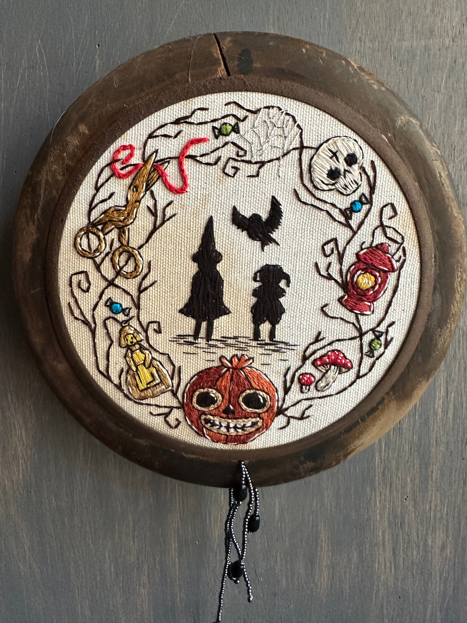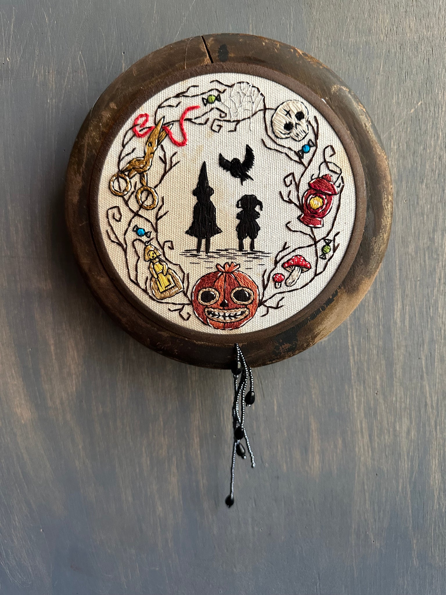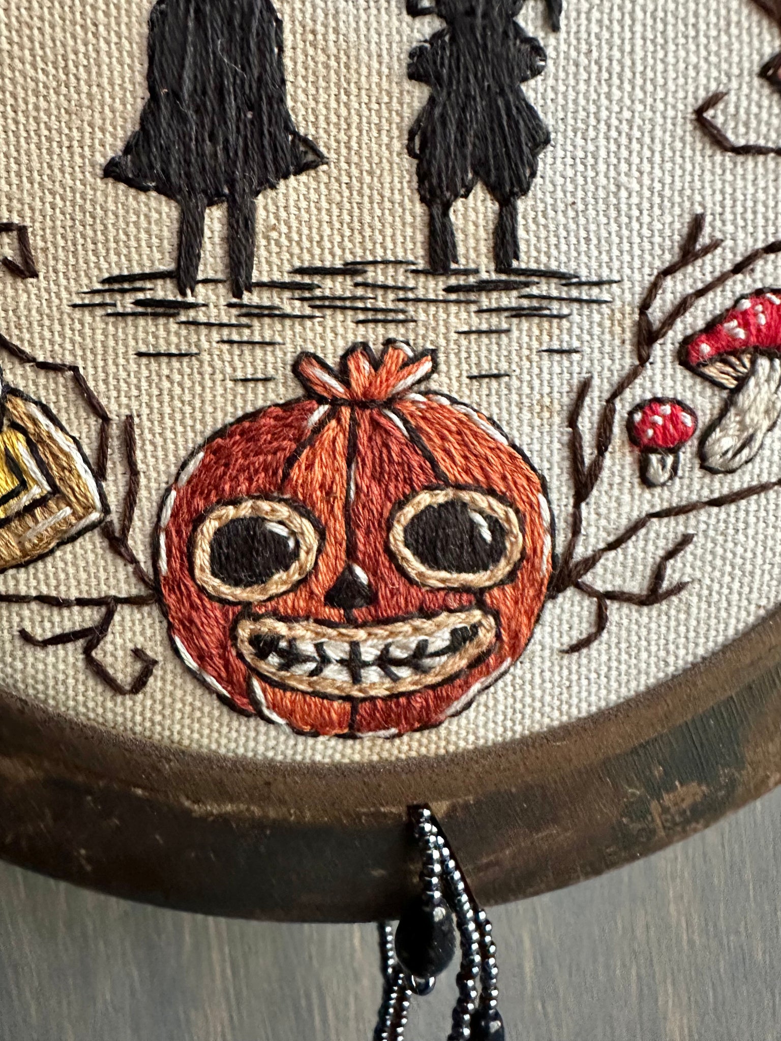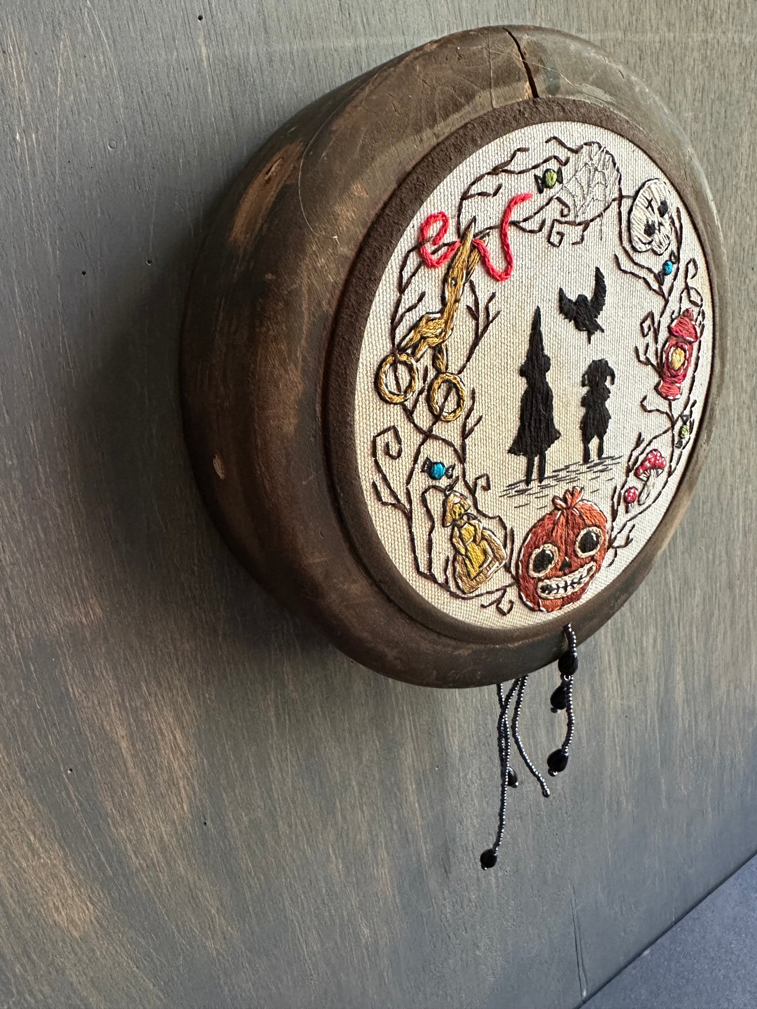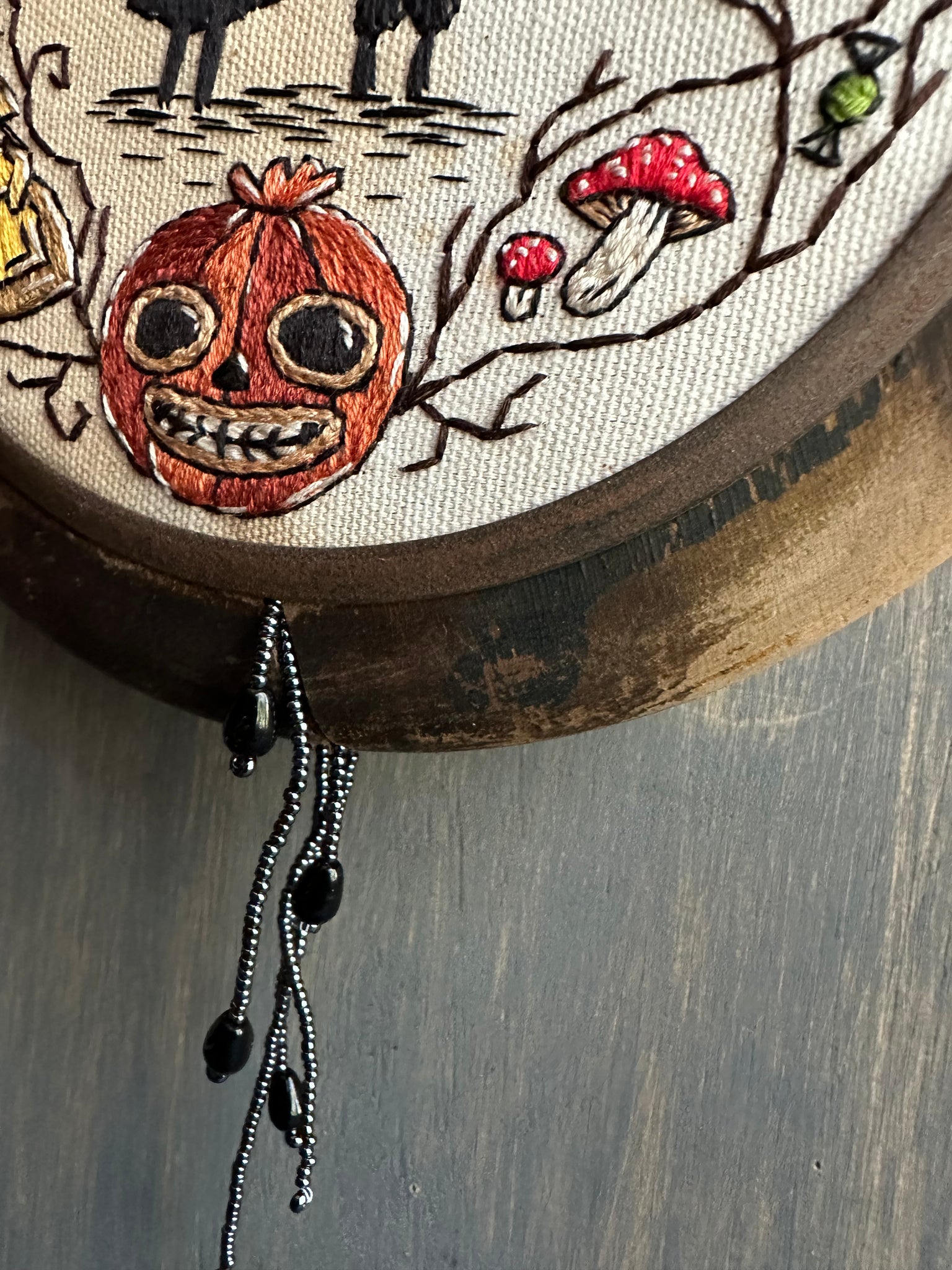 Inspired by the animated Halloween classic.  Characters from the cartoon are hand embroidered on tea stained canvas fabric.  This embroidery is set in a very old and broken wooden clock frame.  The wood is scratched, cracked, distressed and very worn.  There are a series of holes around the edges.  Framing the embroidery is a rusty metal ring.  It is rusted.  The worn and broken state of the clock frame represents the state of the world our heroes find themselves in.  Through the bottom cracks leak the lanterns oil, made of beaded strands.