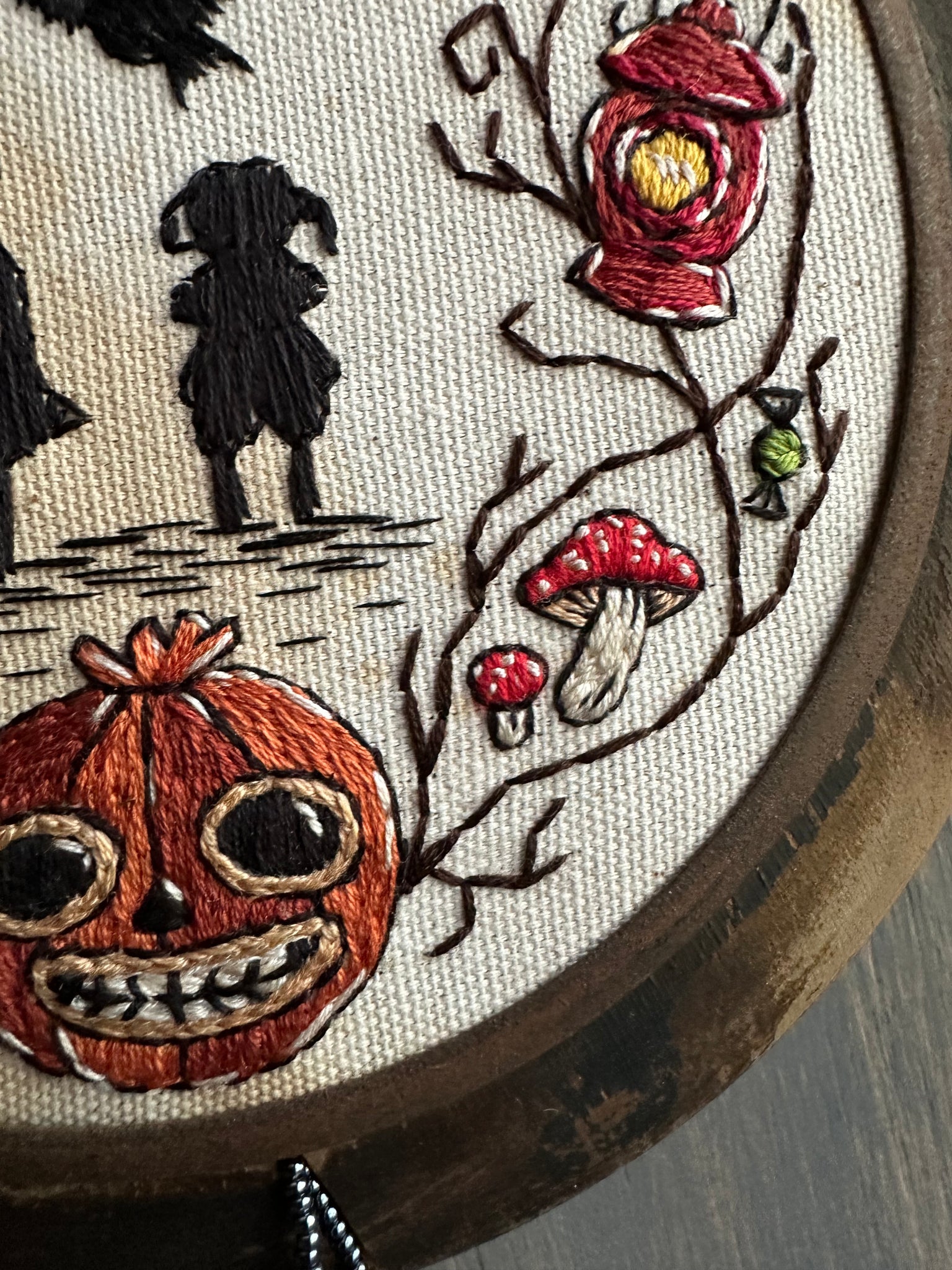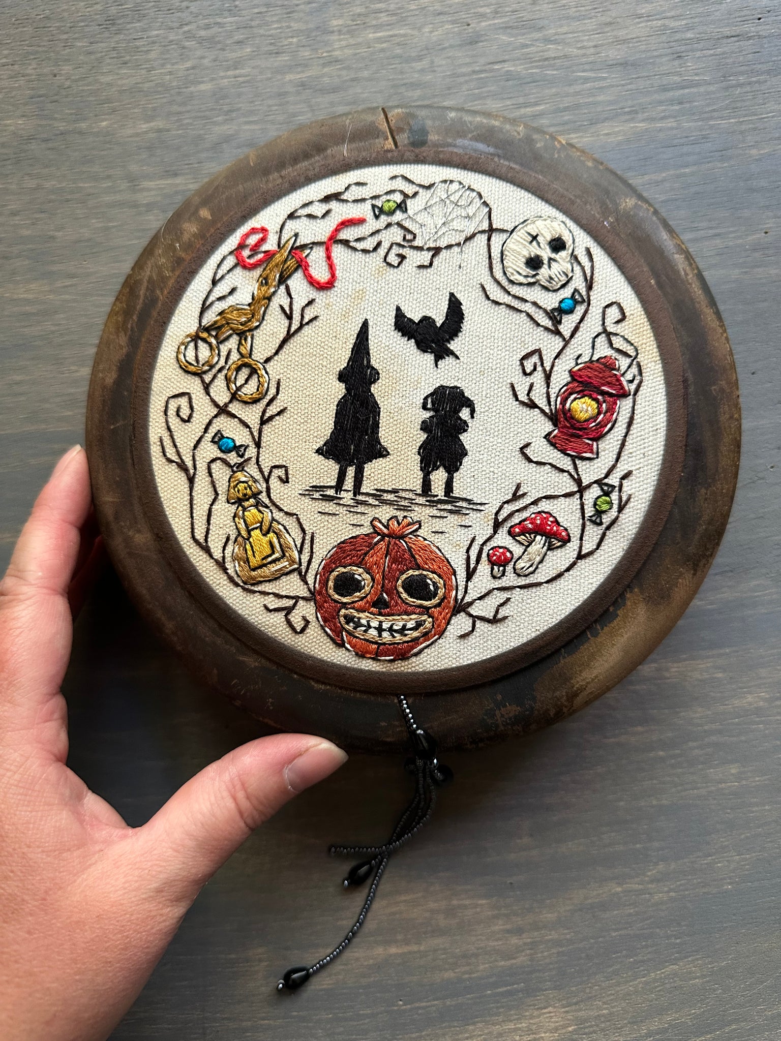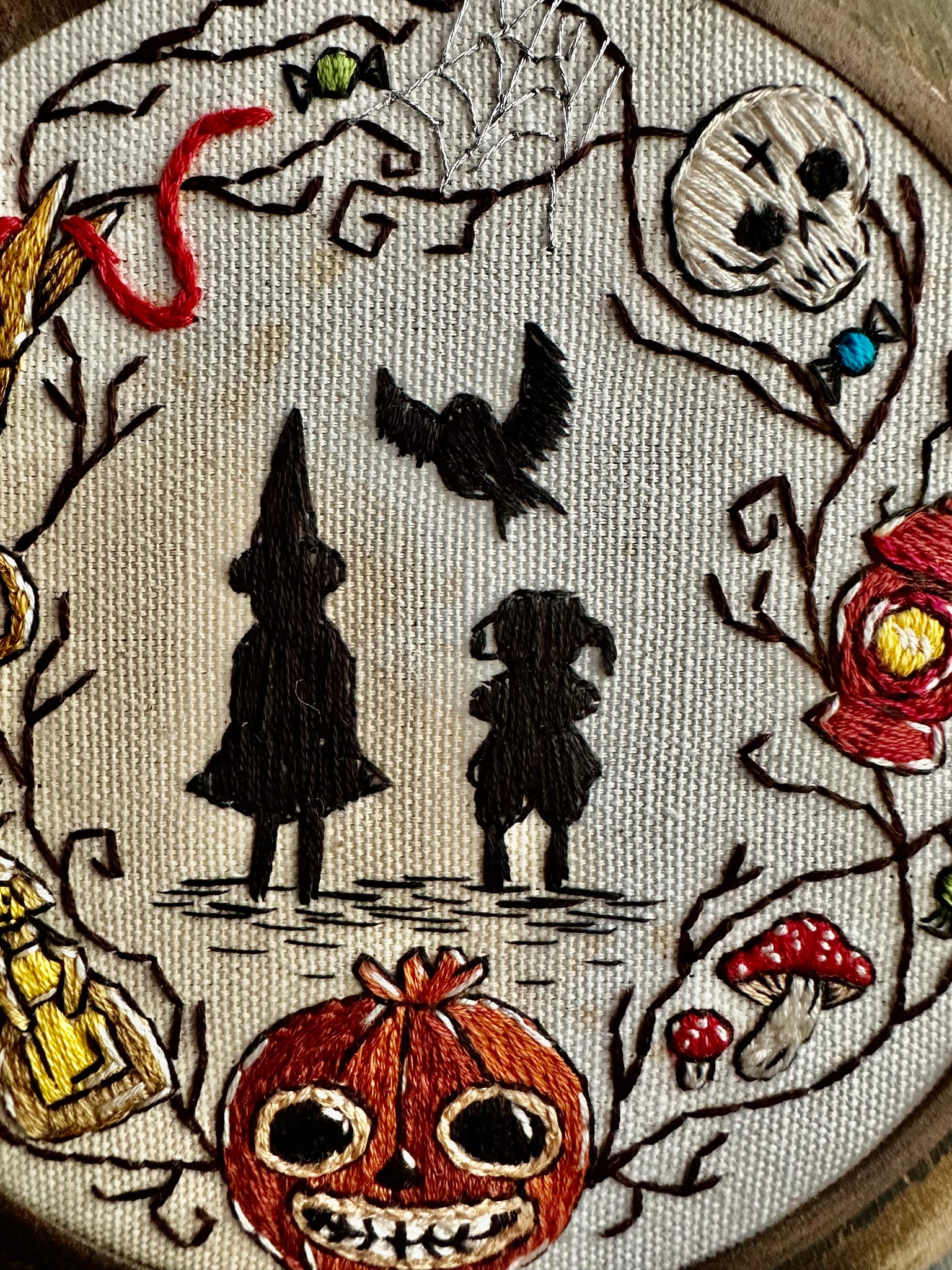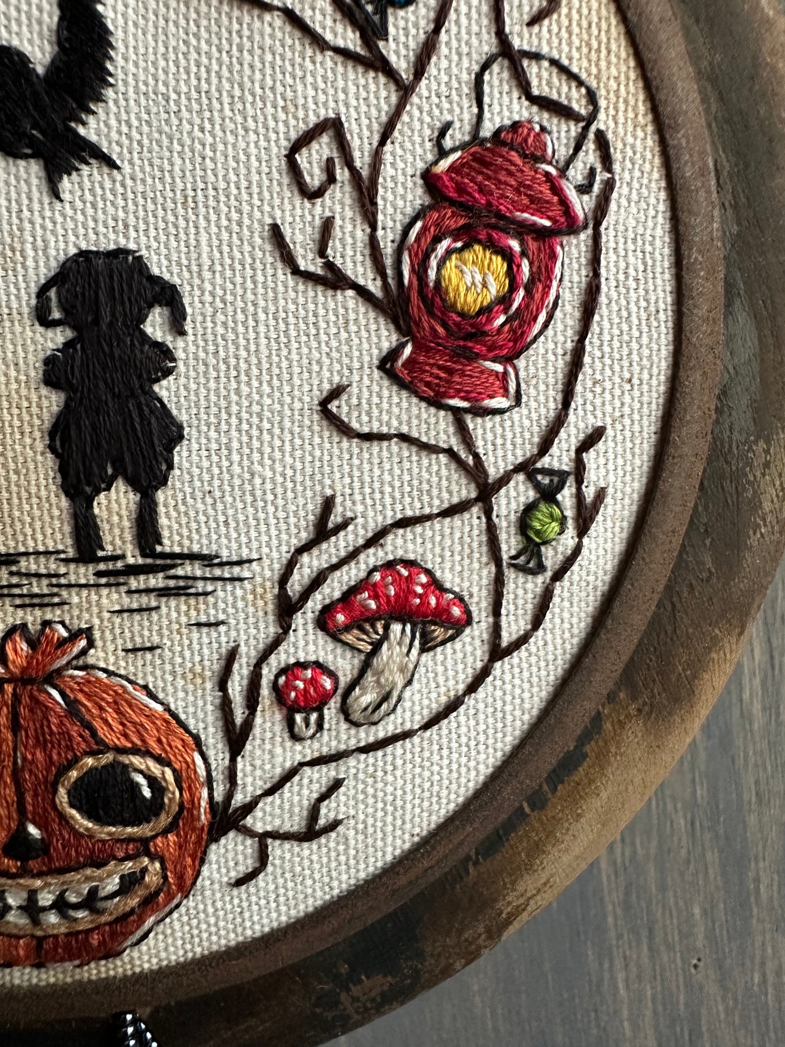 Inspired by the animated Halloween classic.  Characters from the cartoon are hand embroidered on tea stained canvas fabric.  This embroidery is set in a very old and broken wooden clock frame.  The wood is scratched, cracked, distressed and very worn.  There are a series of holes around the edges.  Framing the embroidery is a rusty metal ring.  It is rusted.  The worn and broken state of the clock frame represents the state of the world our heroes find themselves in.  Through the bottom cracks leak the lanterns oil, made of beaded strands.