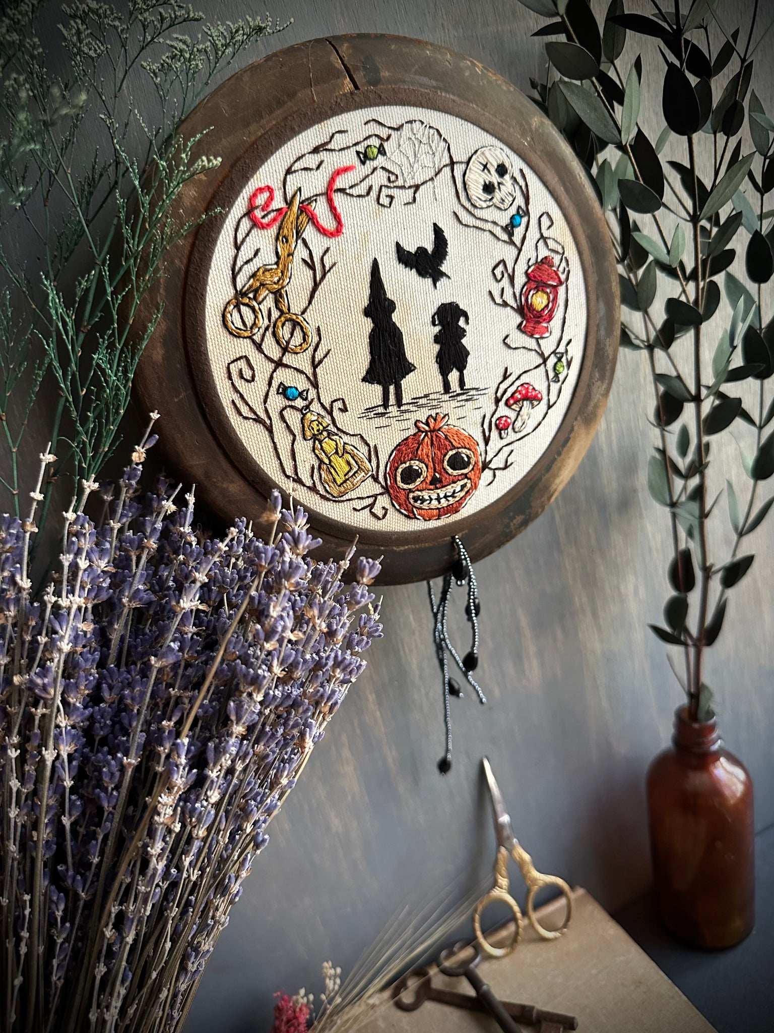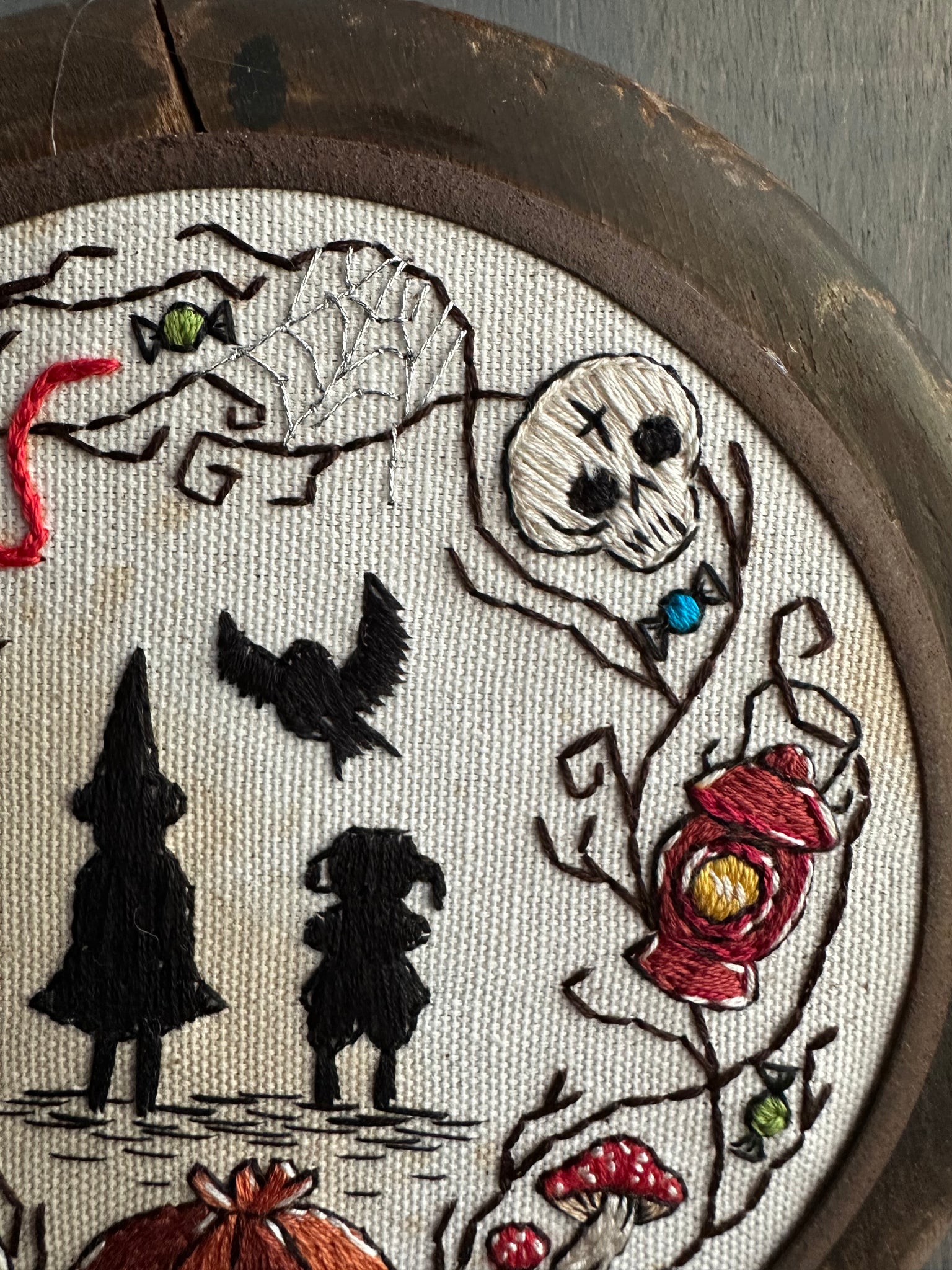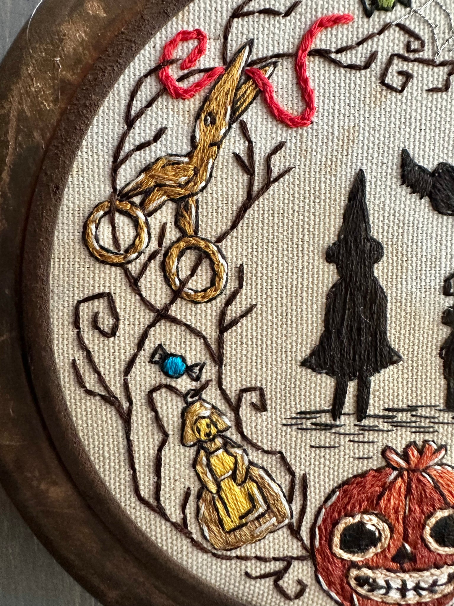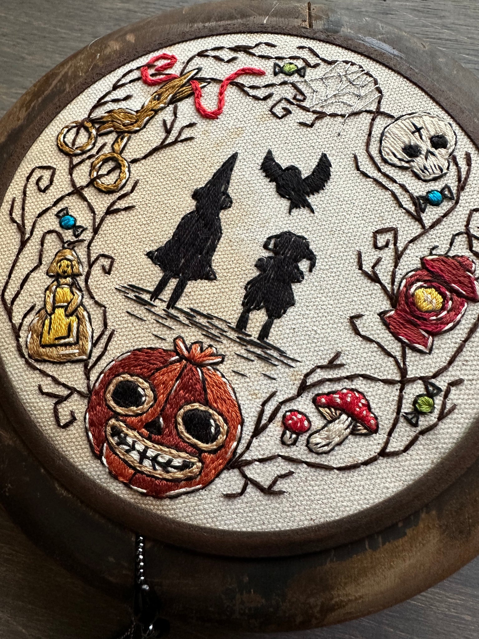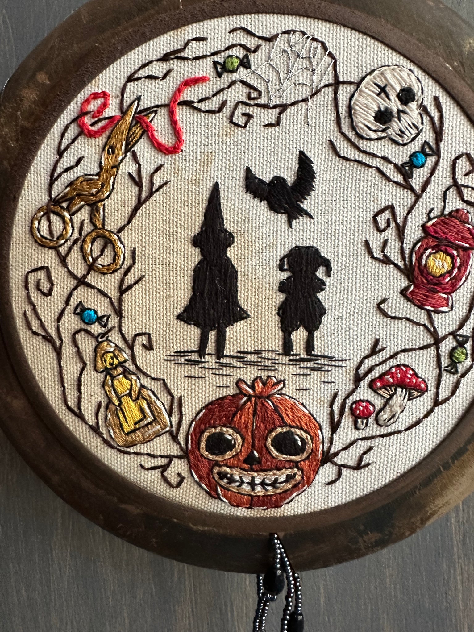 Inspired by the animated Halloween classic.  Characters from the cartoon are hand embroidered on tea stained canvas fabric.  This embroidery is set in a very old and broken wooden clock frame.  The wood is scratched, cracked, distressed and very worn.  There are a series of holes around the edges.  Framing the embroidery is a rusty metal ring.  It is rusted.  The worn and broken state of the clock frame represents the state of the world our heroes find themselves in.  Through the bottom cracks leak the lanterns oil, made of beaded strands.