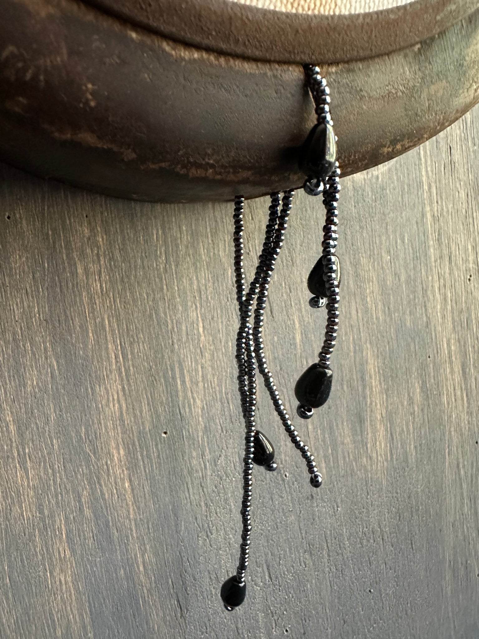 Approximate Measurements- 7" round, 1.75" deep, beads hand about 3.75"