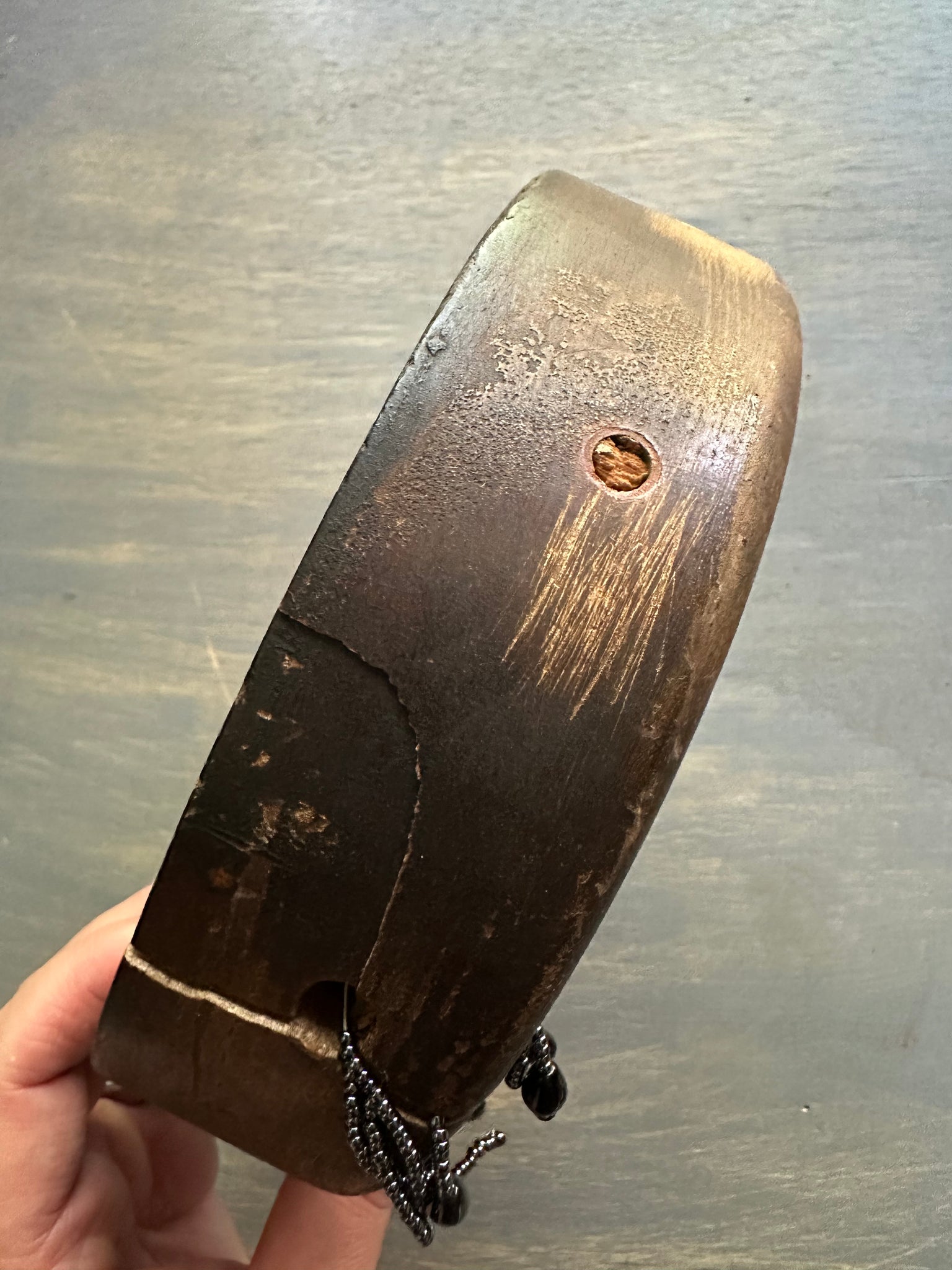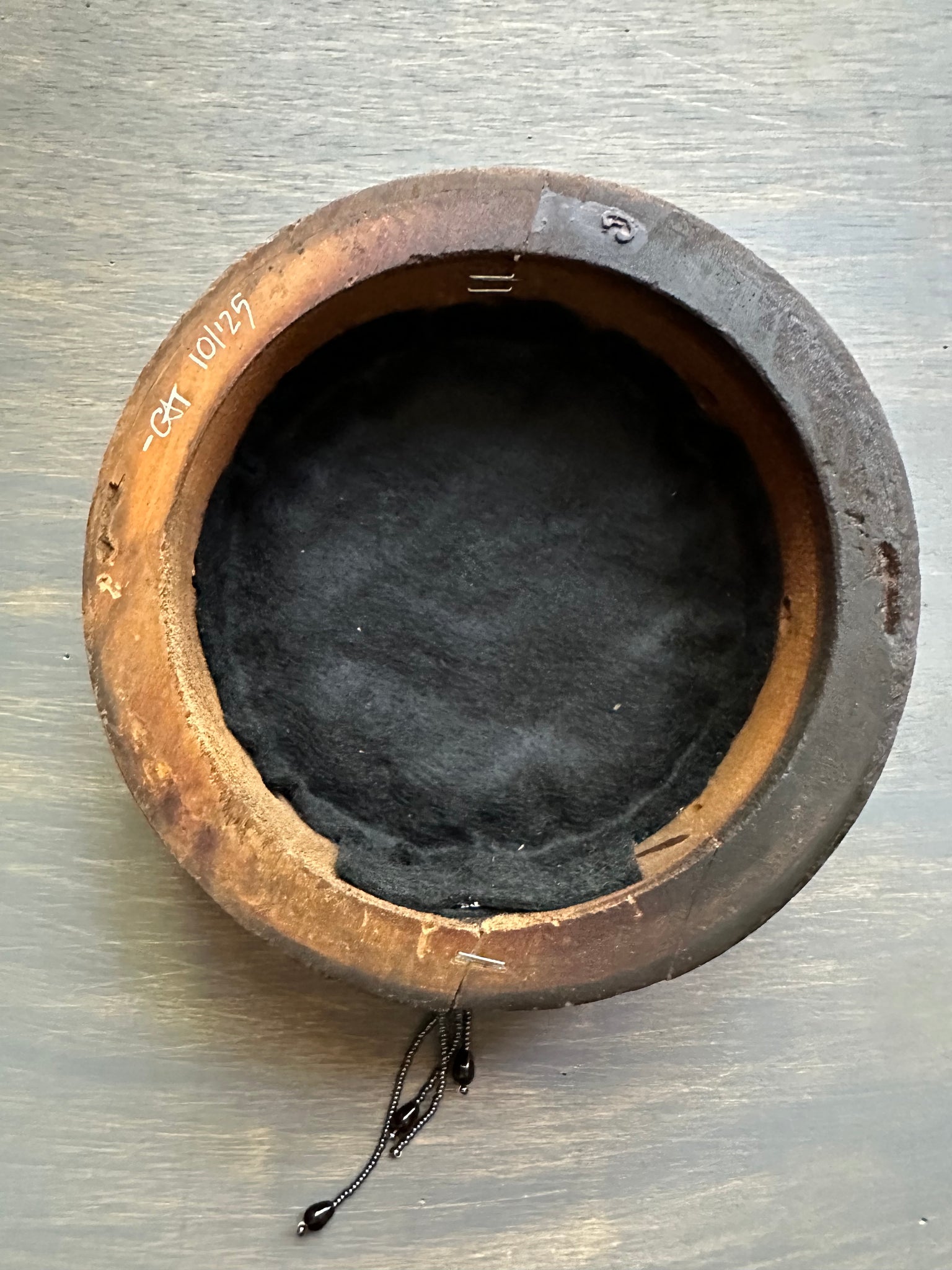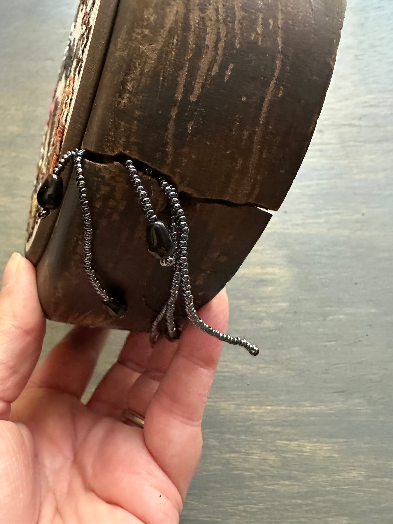 Handmade piece set in a cracked and worn vintage wooden frame. Imperfections are to be expected. Please examine the images closely and read the full description to avoid disappointment as returns are not accepted.