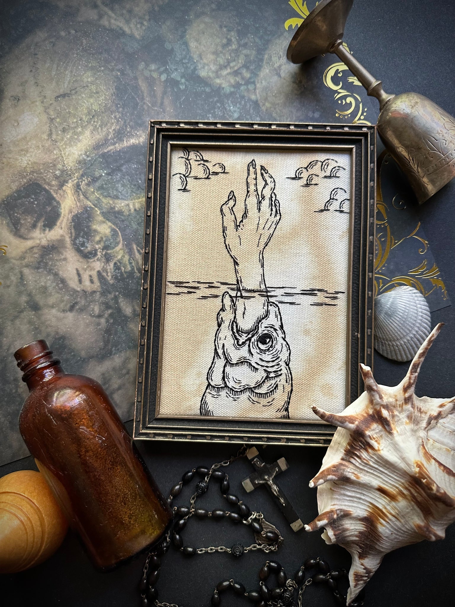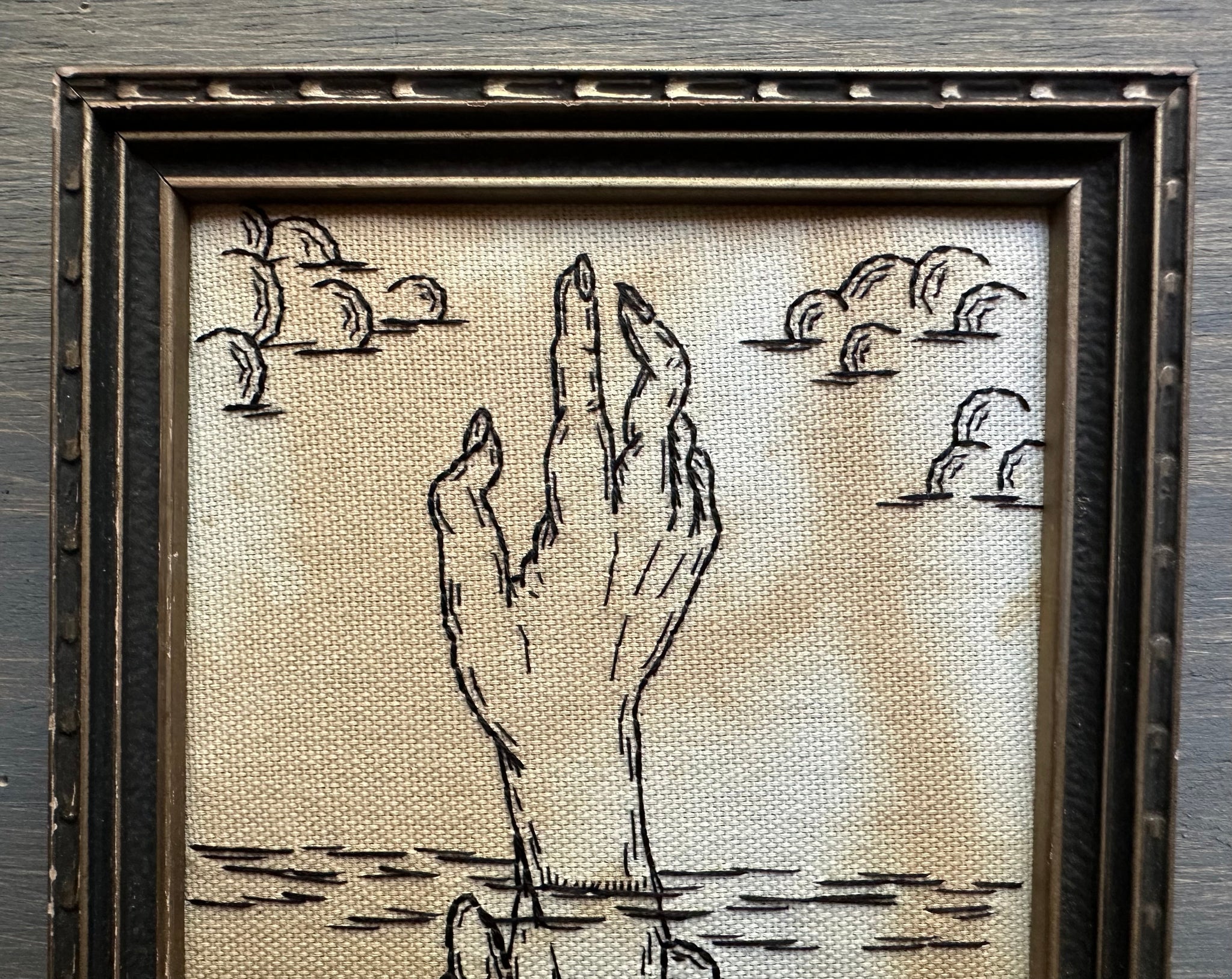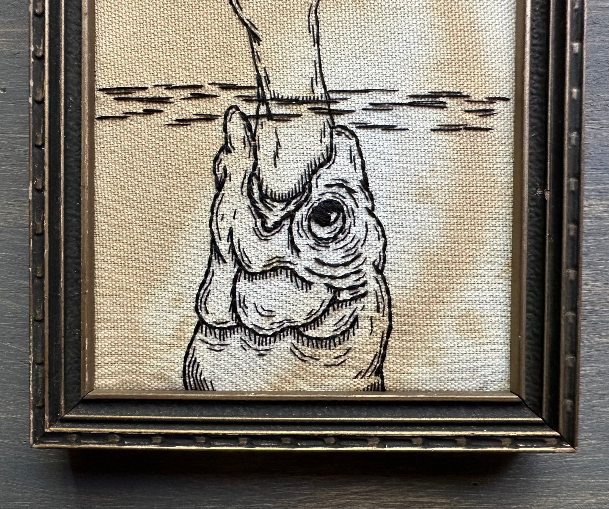 Strange things can be seen when lost at sea. Hand embroidered on tea stained canvas. Set in a vintage wooden frame that is chipped, scratched, discolored and worn due to age.