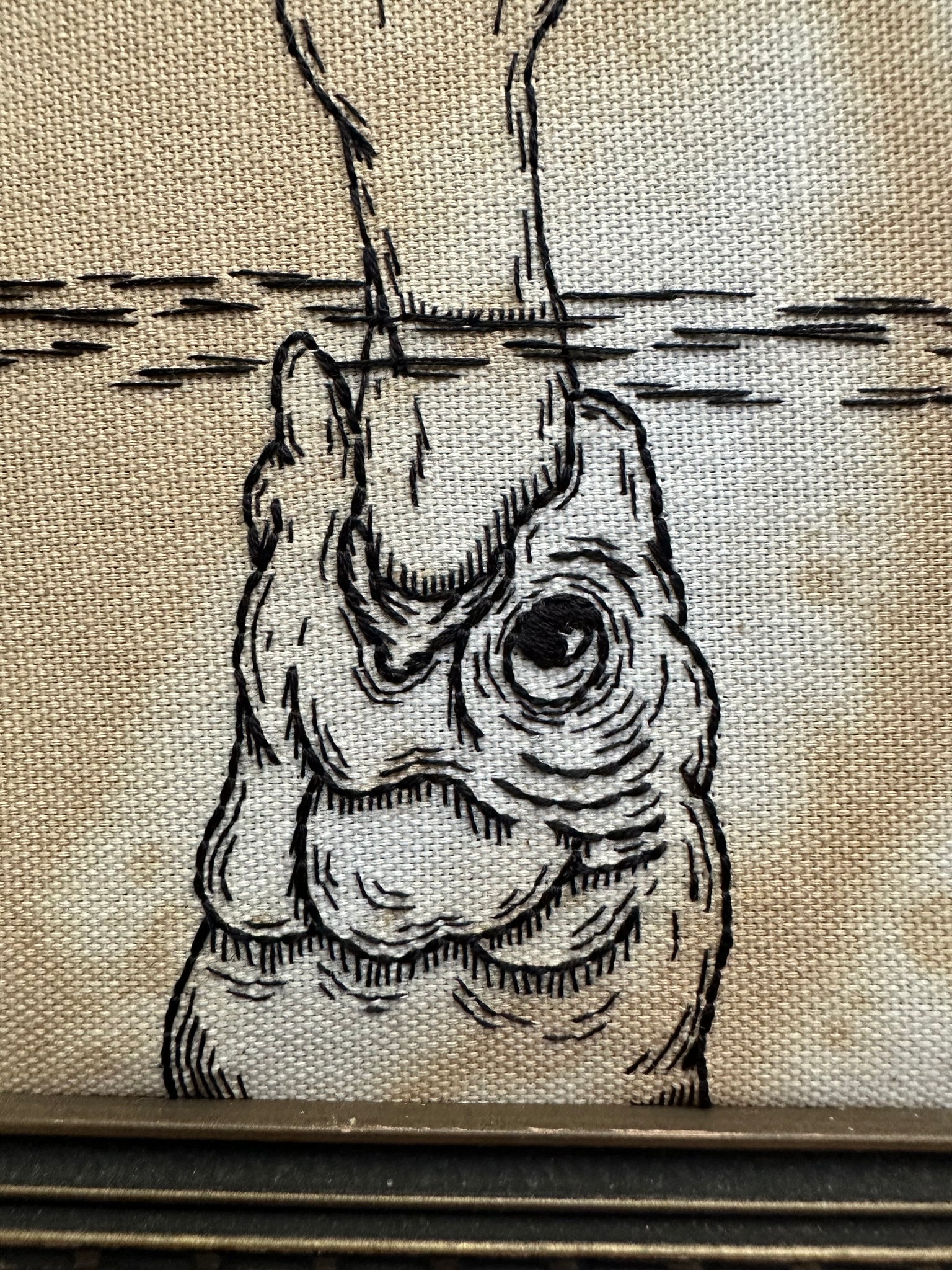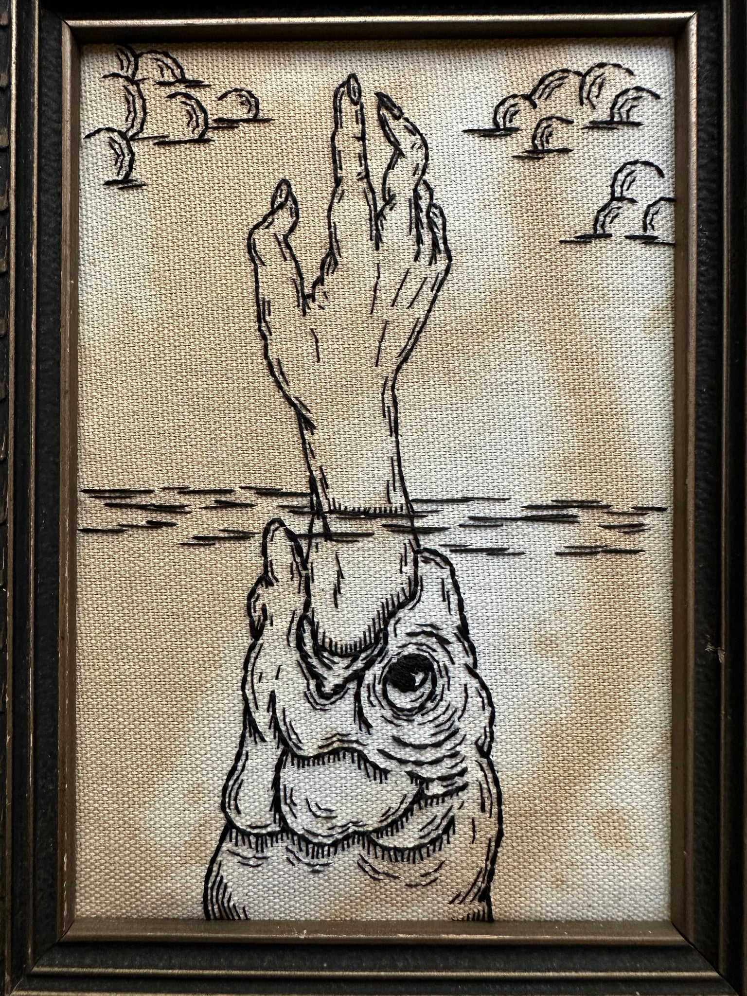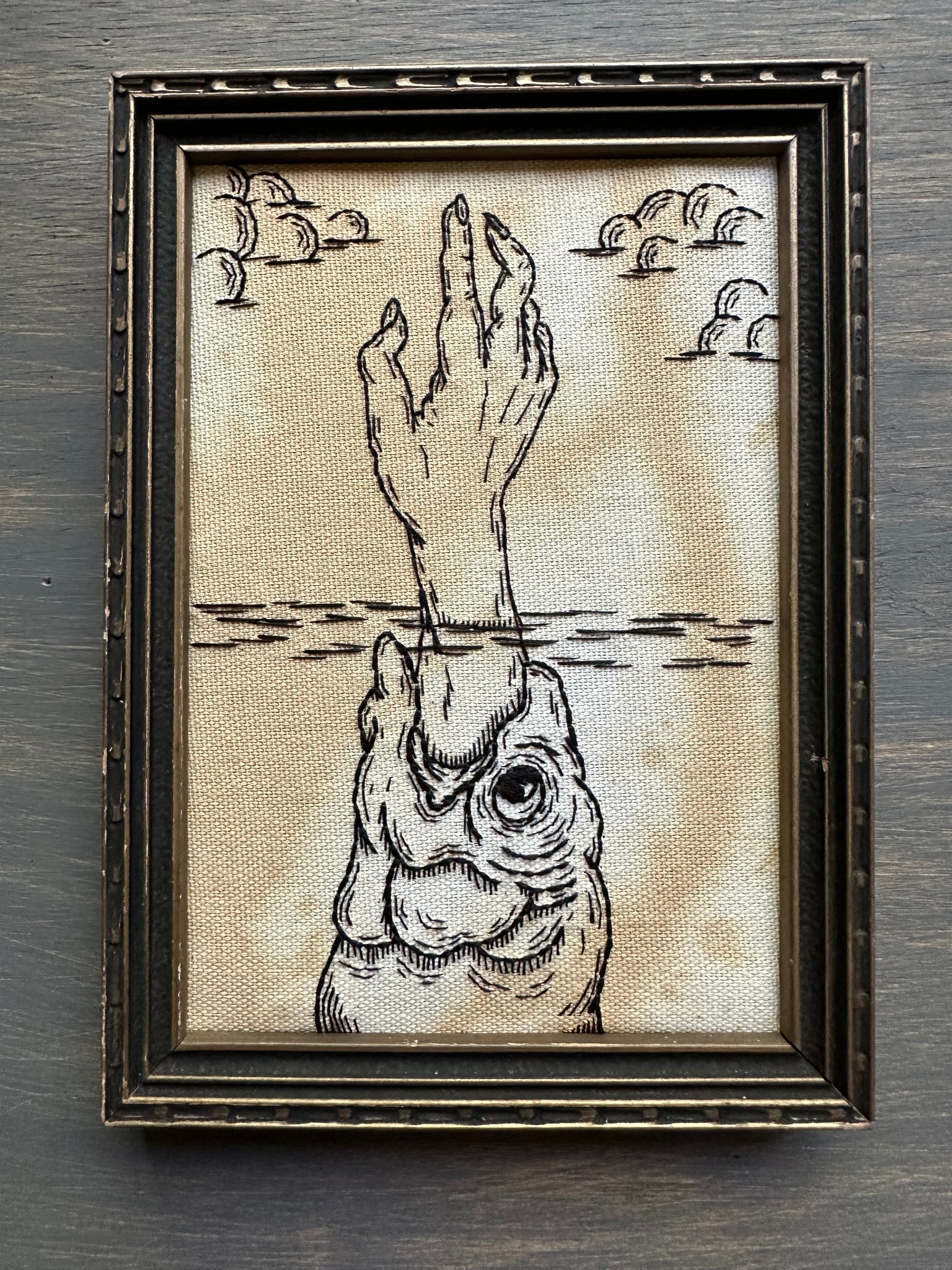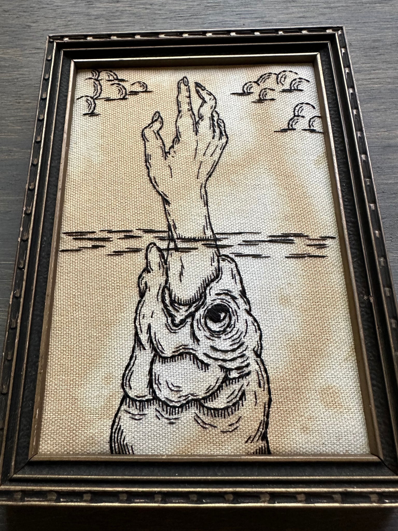 Strange things can be seen when lost at sea. Hand embroidered on tea stained canvas. Set in a vintage wooden frame that is chipped, scratched, discolored and worn due to age.