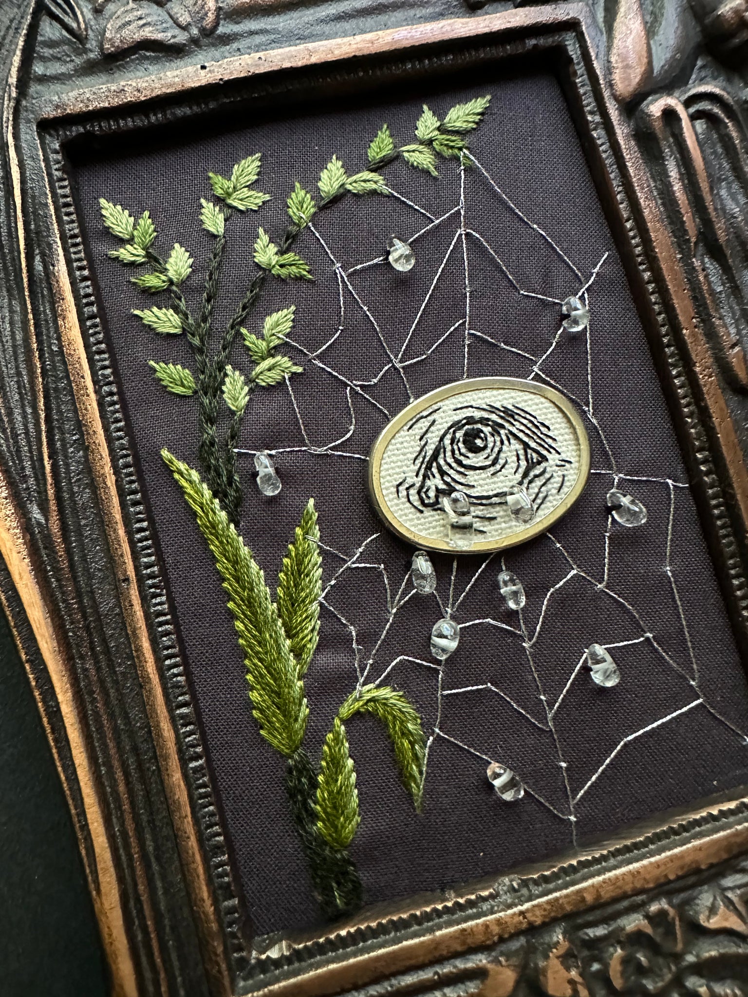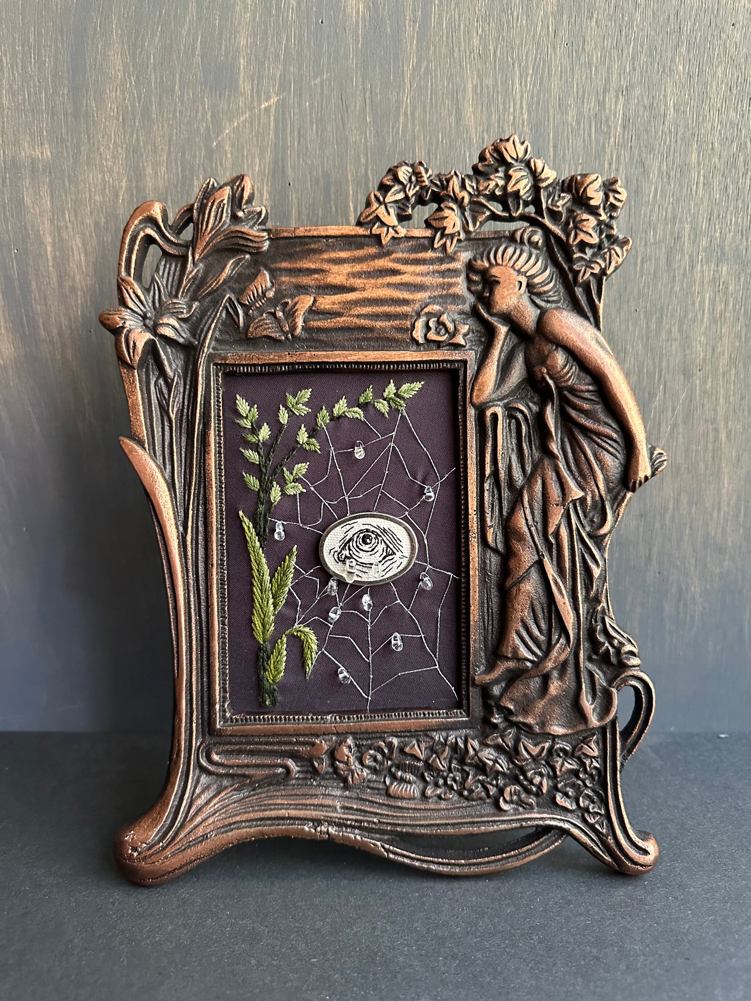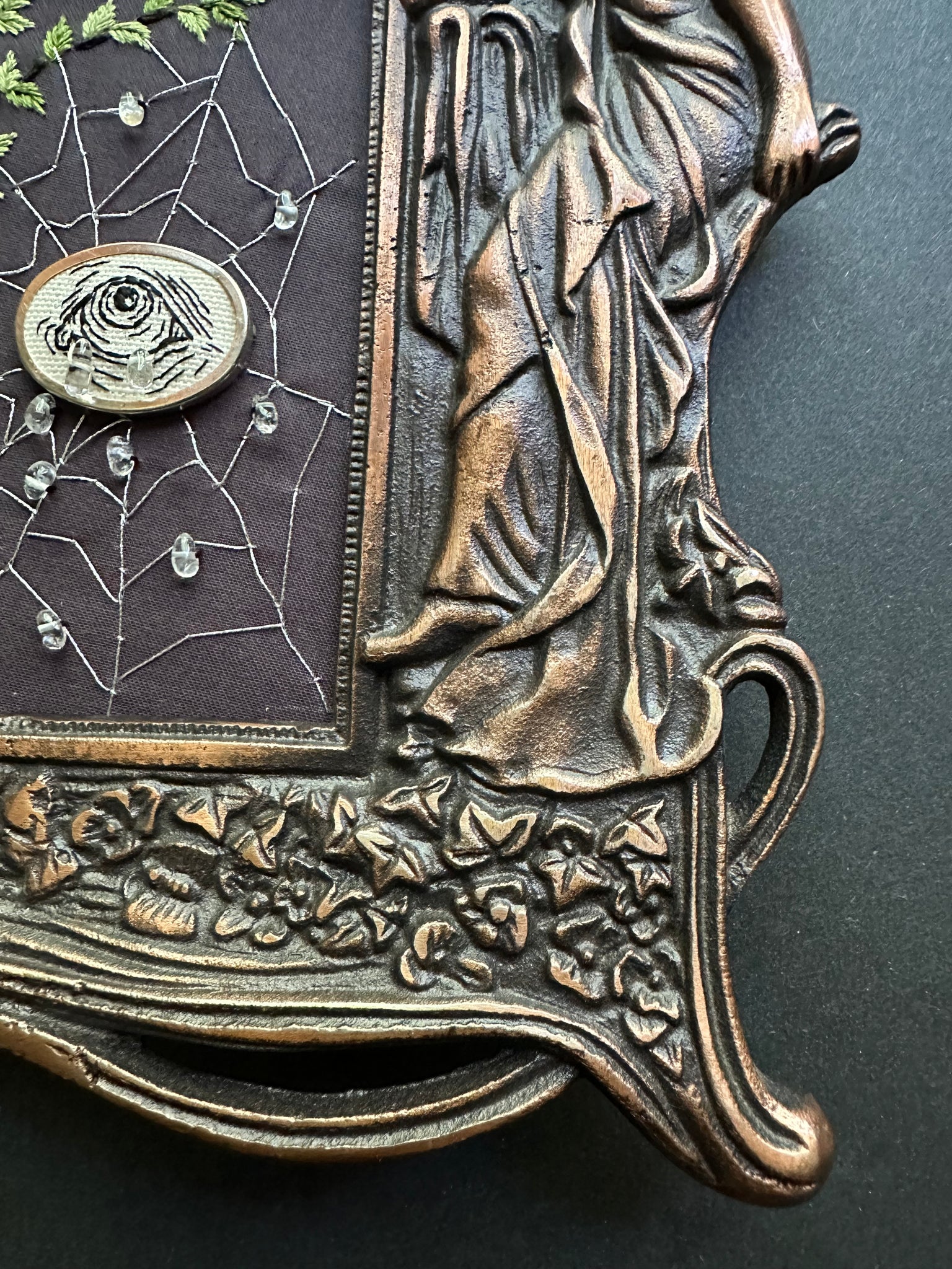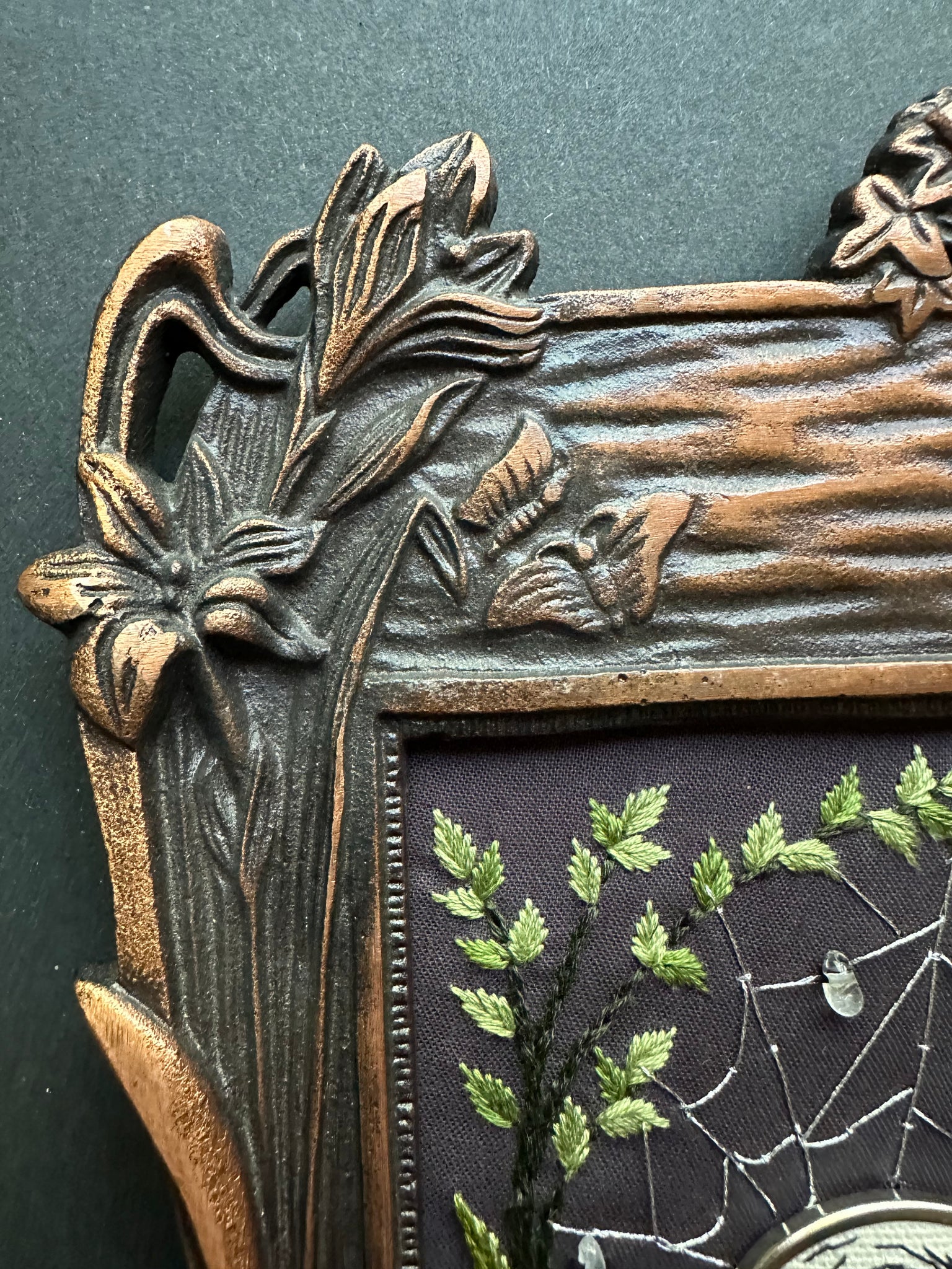 Tangled in life, lost in a web. Hand embroidered on charcoal grey linen with quartz crystal drops. Set in a vintage brass table top frame. Frame is heavy.