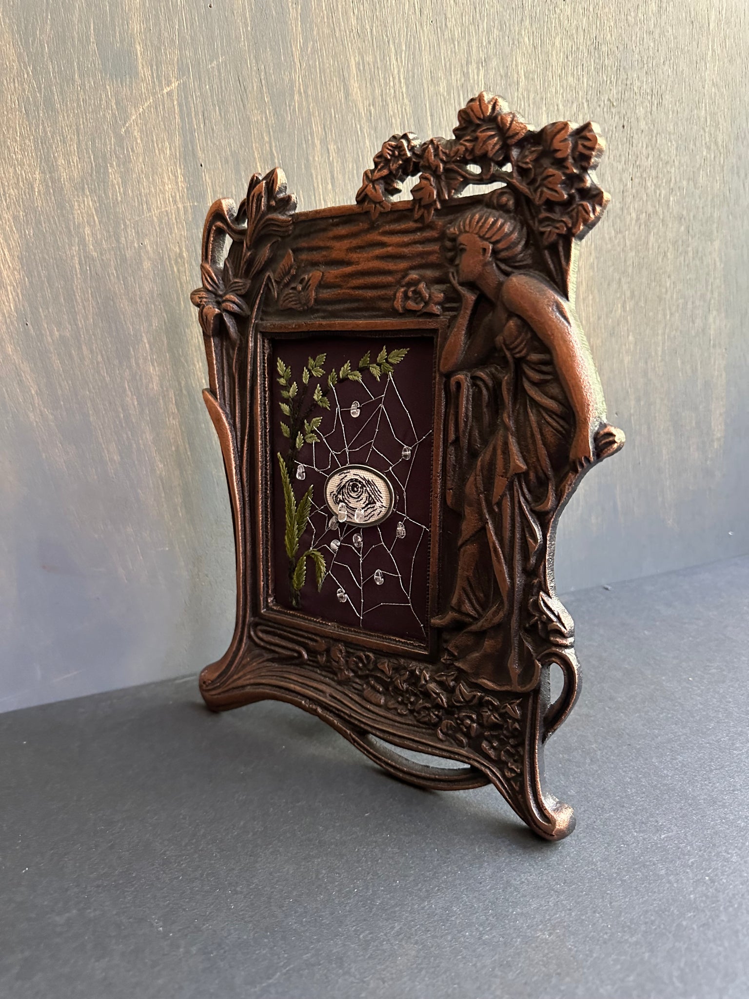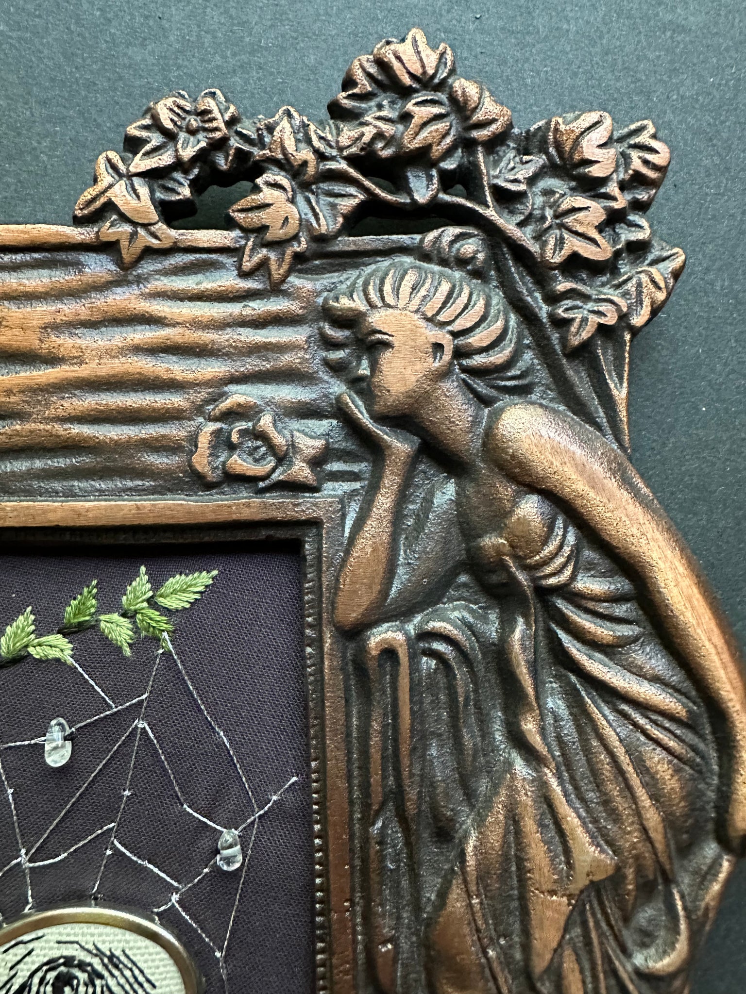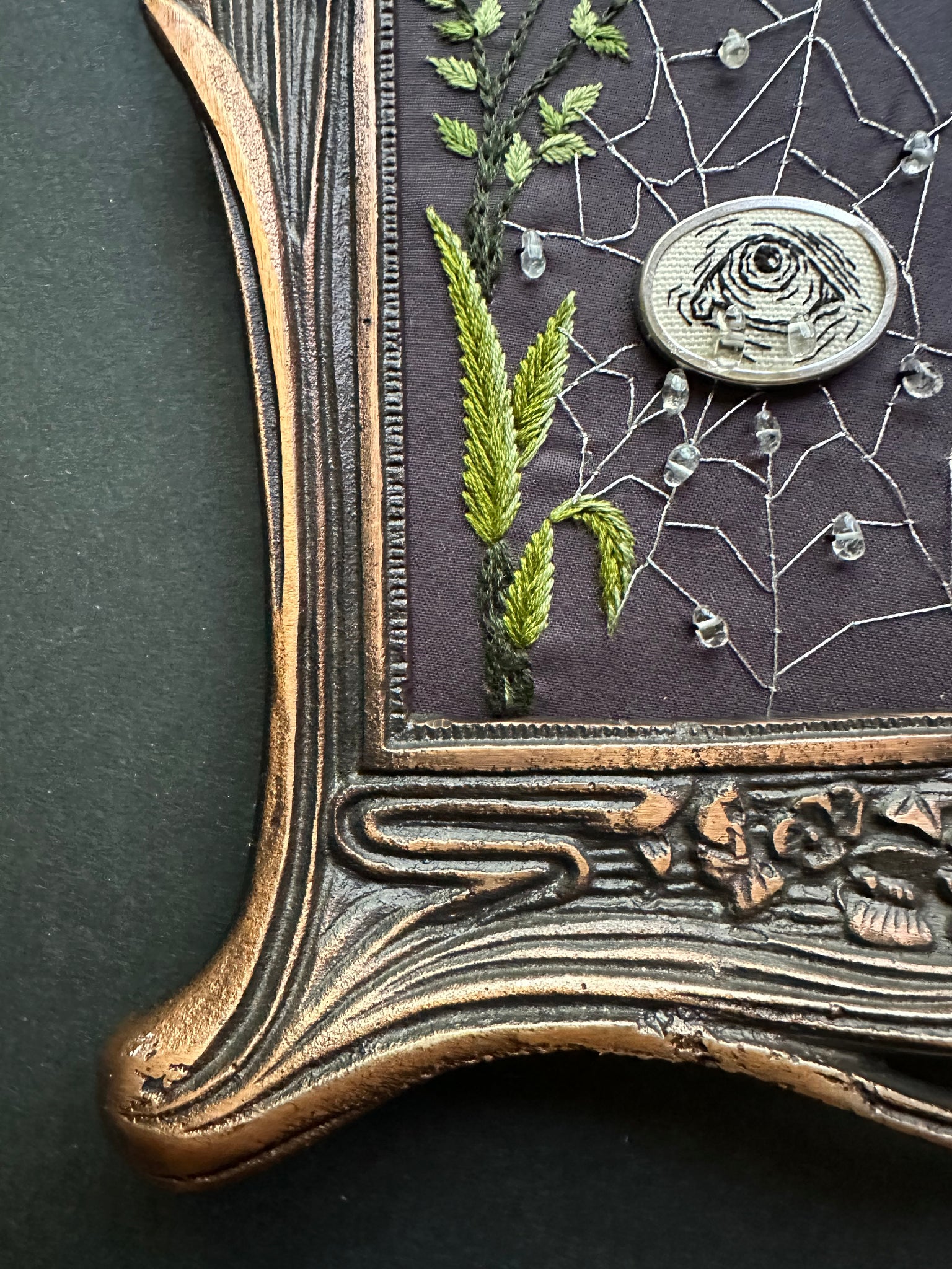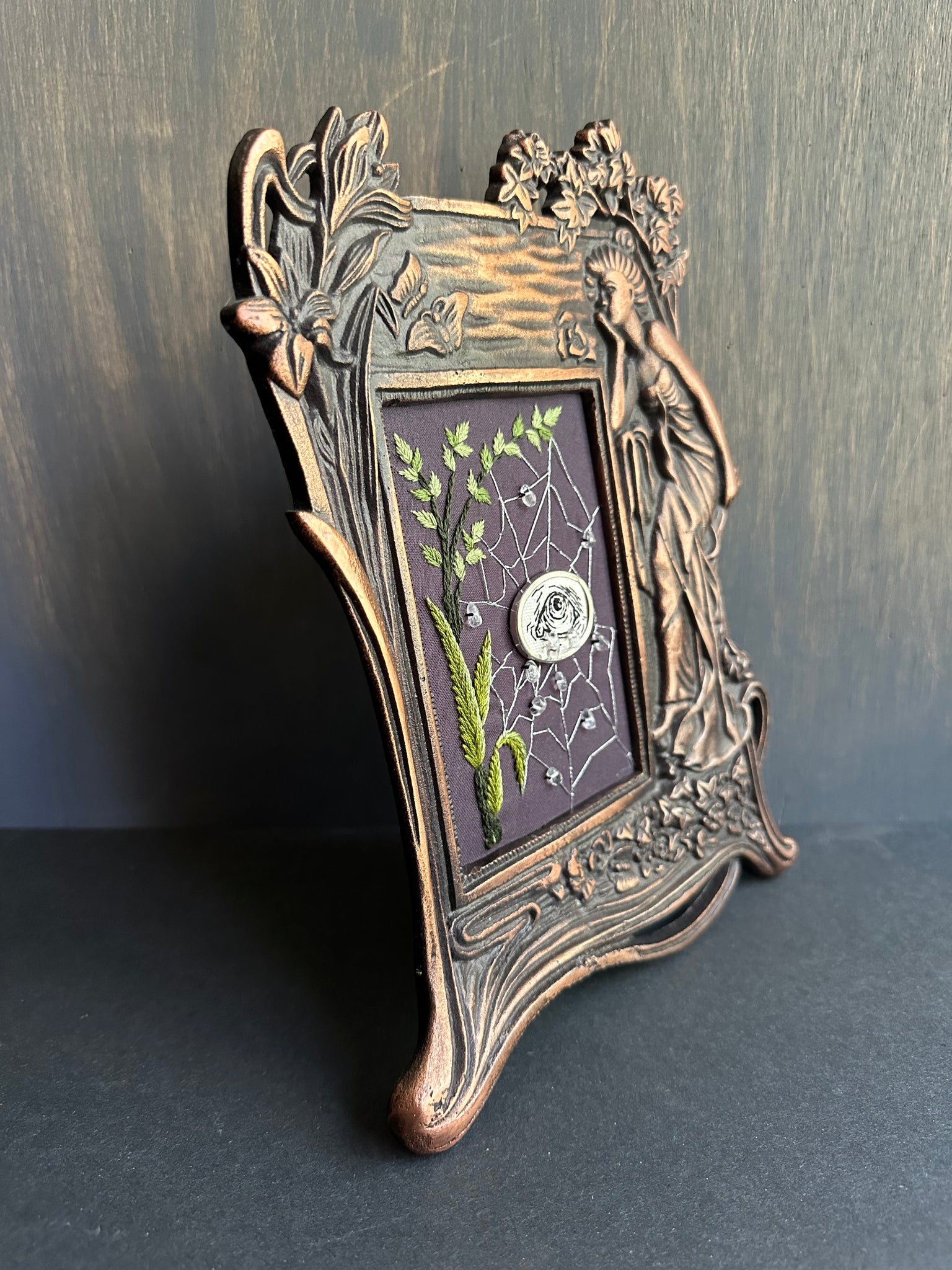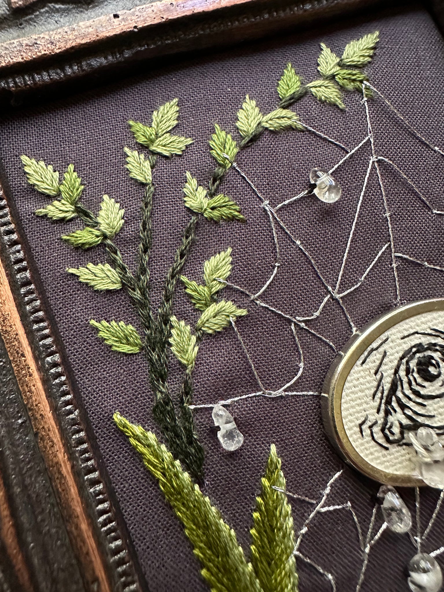 Tangled in life, lost in a web. Hand embroidered on charcoal grey linen with quartz crystal drops. Set in a vintage brass table top frame. Frame is heavy.