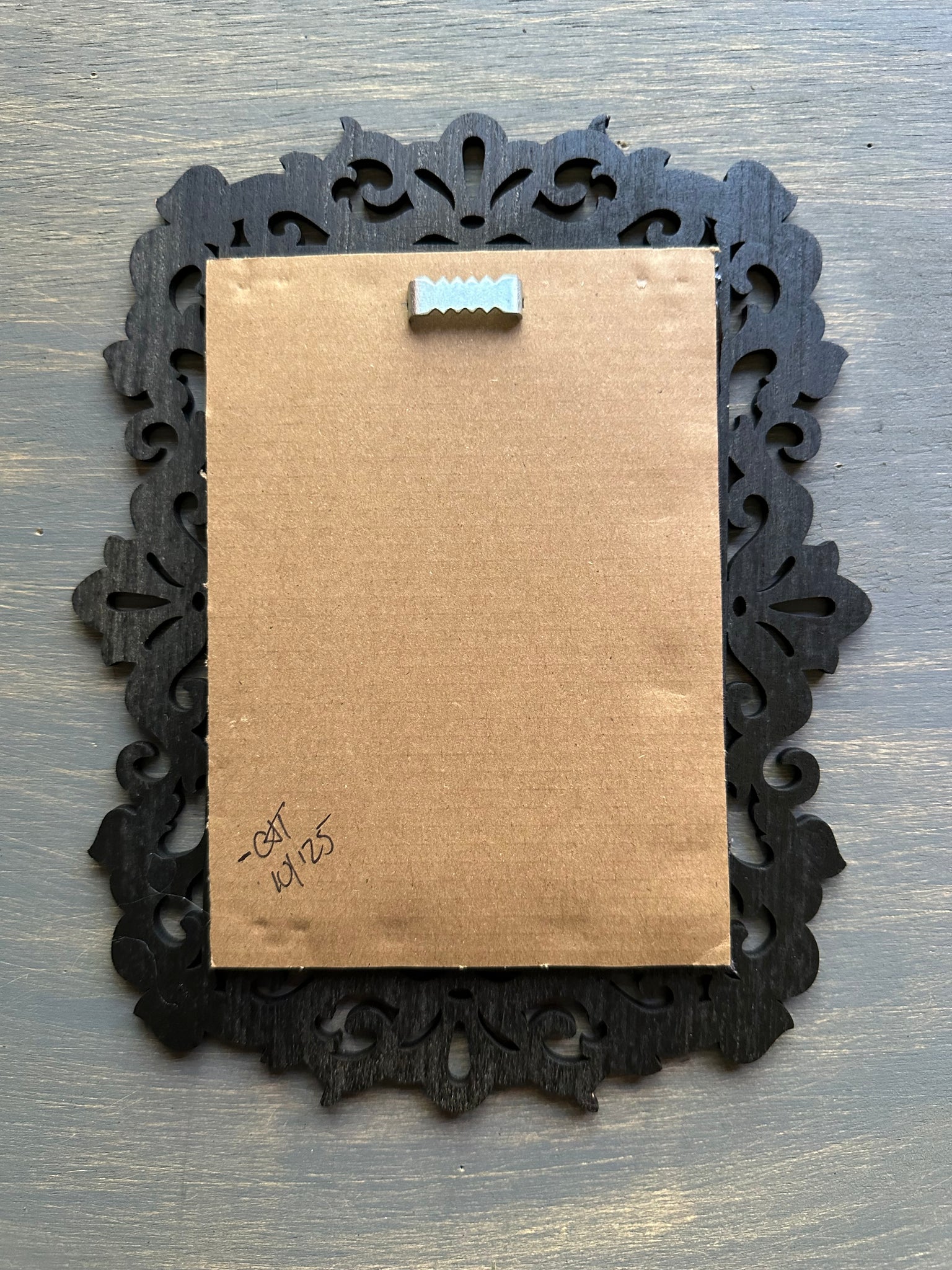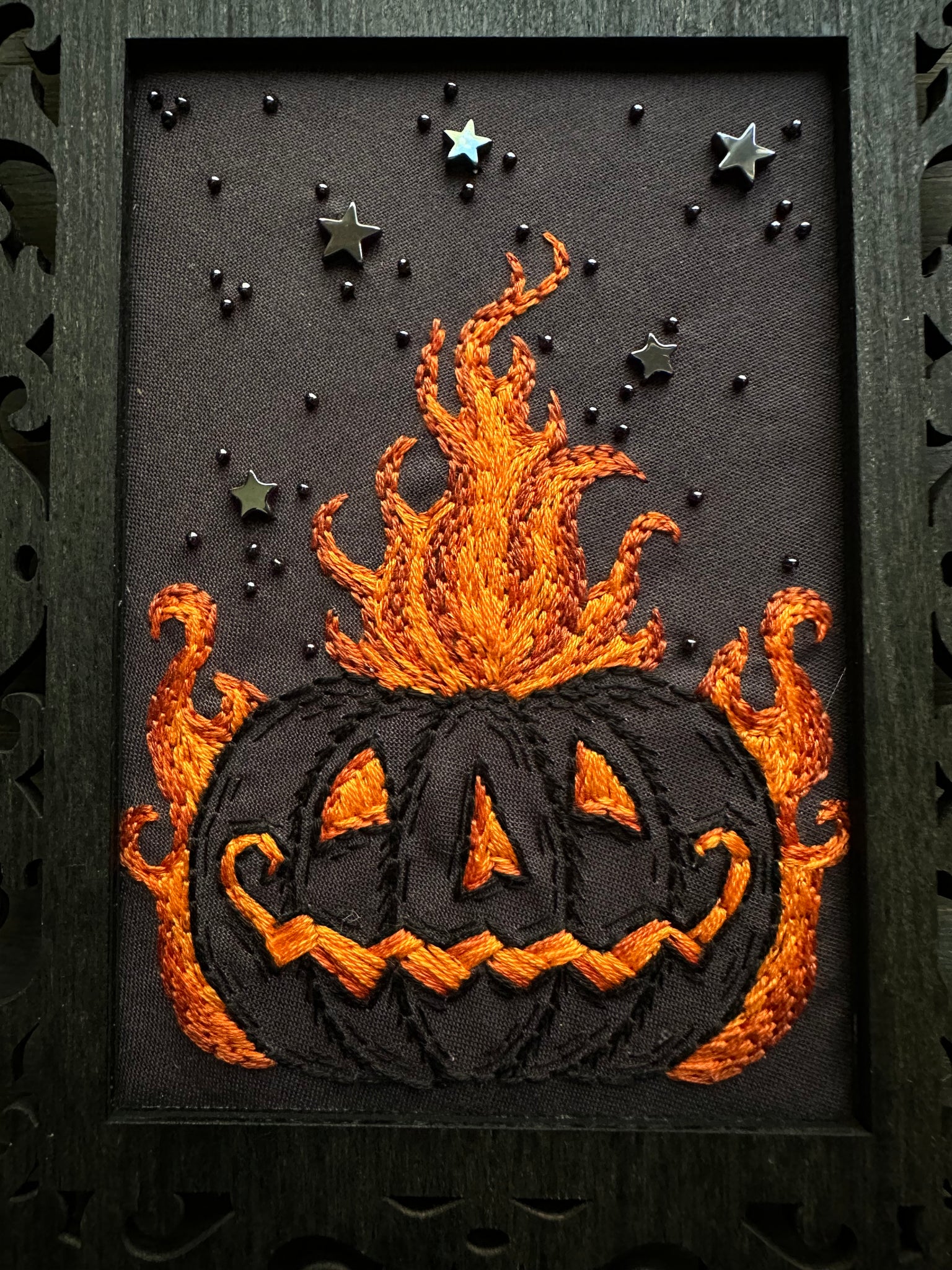 Inspired by the headless horseman. Hand embroidered on charcoal grey linen fabric and accented with beads is a flaming jack o lantern. Set in a wooden frame.